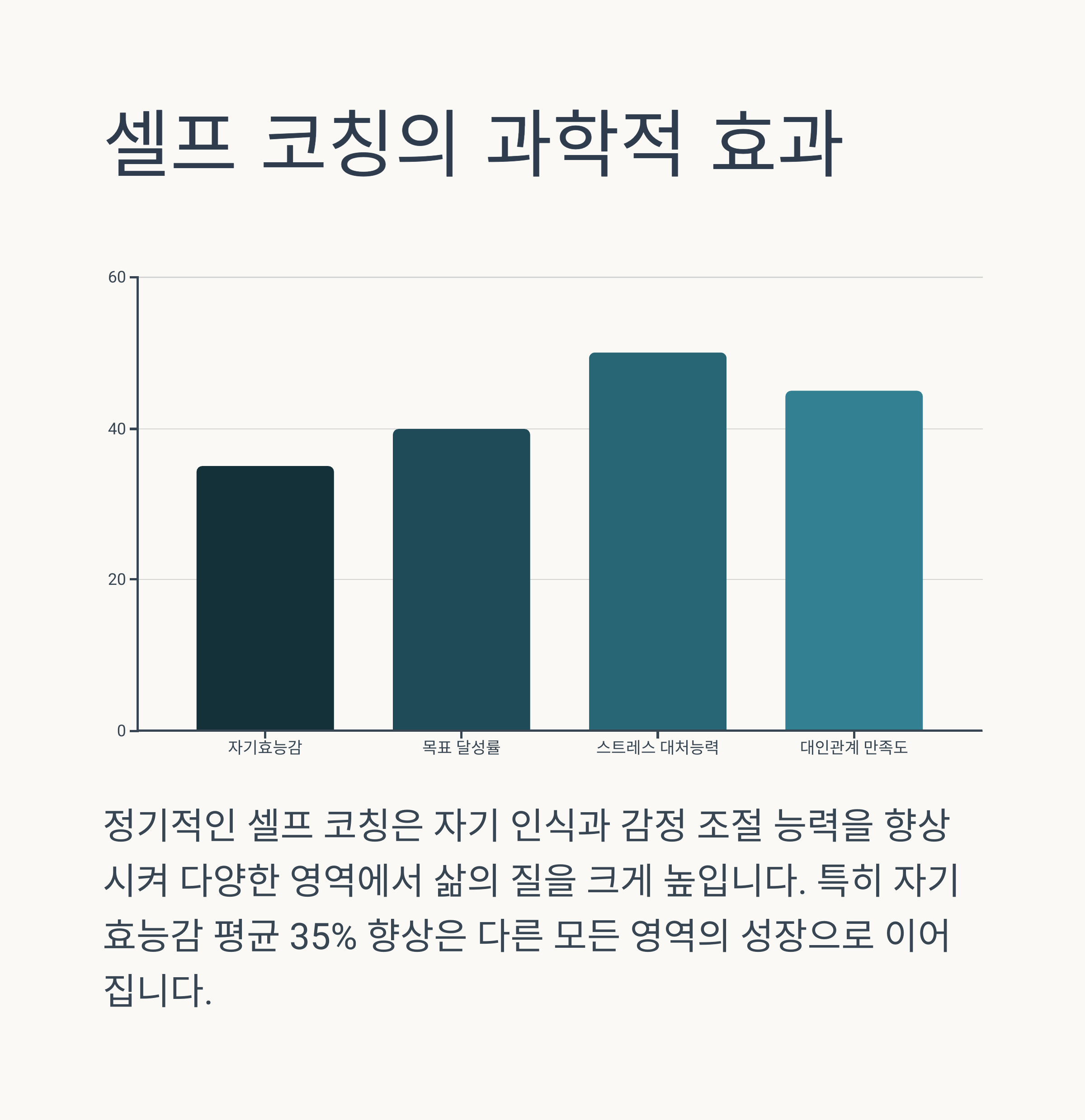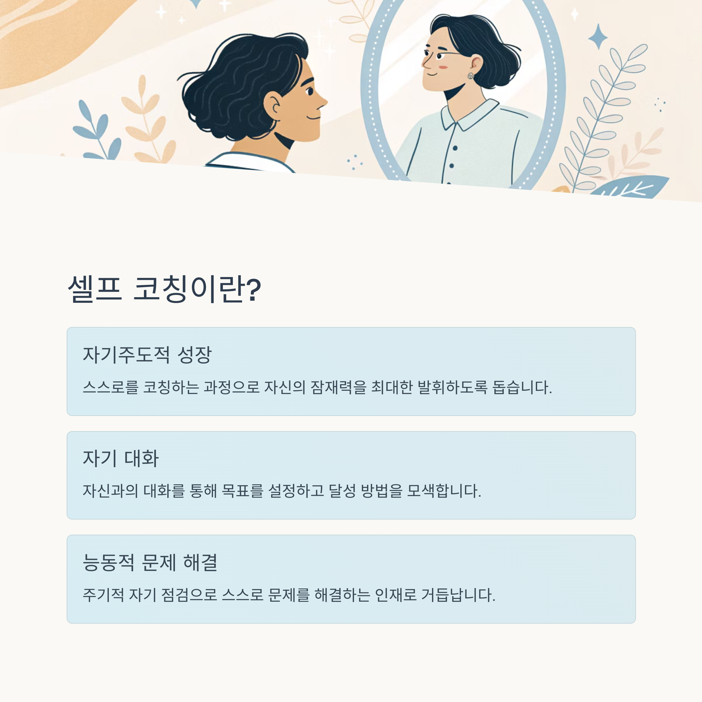 셀프 코칭은 자신의 감정, 생각, 행동을 인지하고 통제하여 목표를 달성하는 중요한 과정입니다.