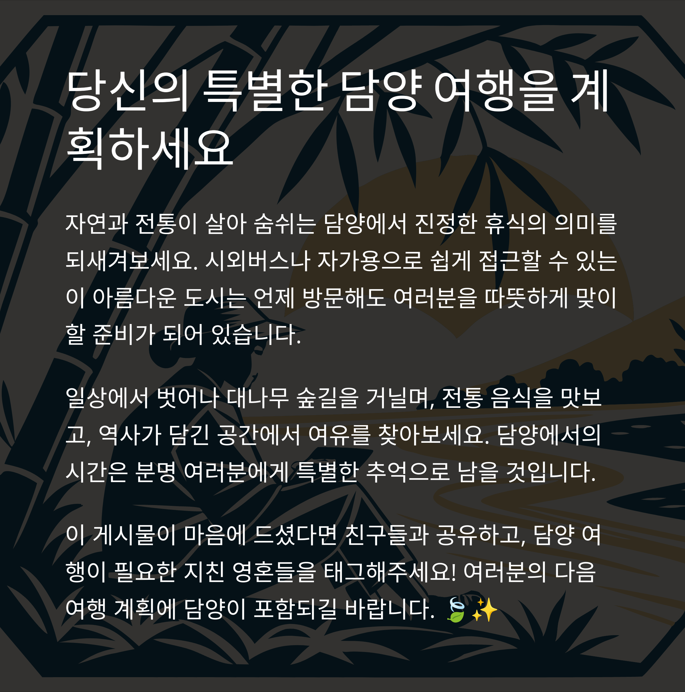 자연과 전통이 어우러진 담양에서의 경험을 통해 몸과 마음을 치유받으세요.