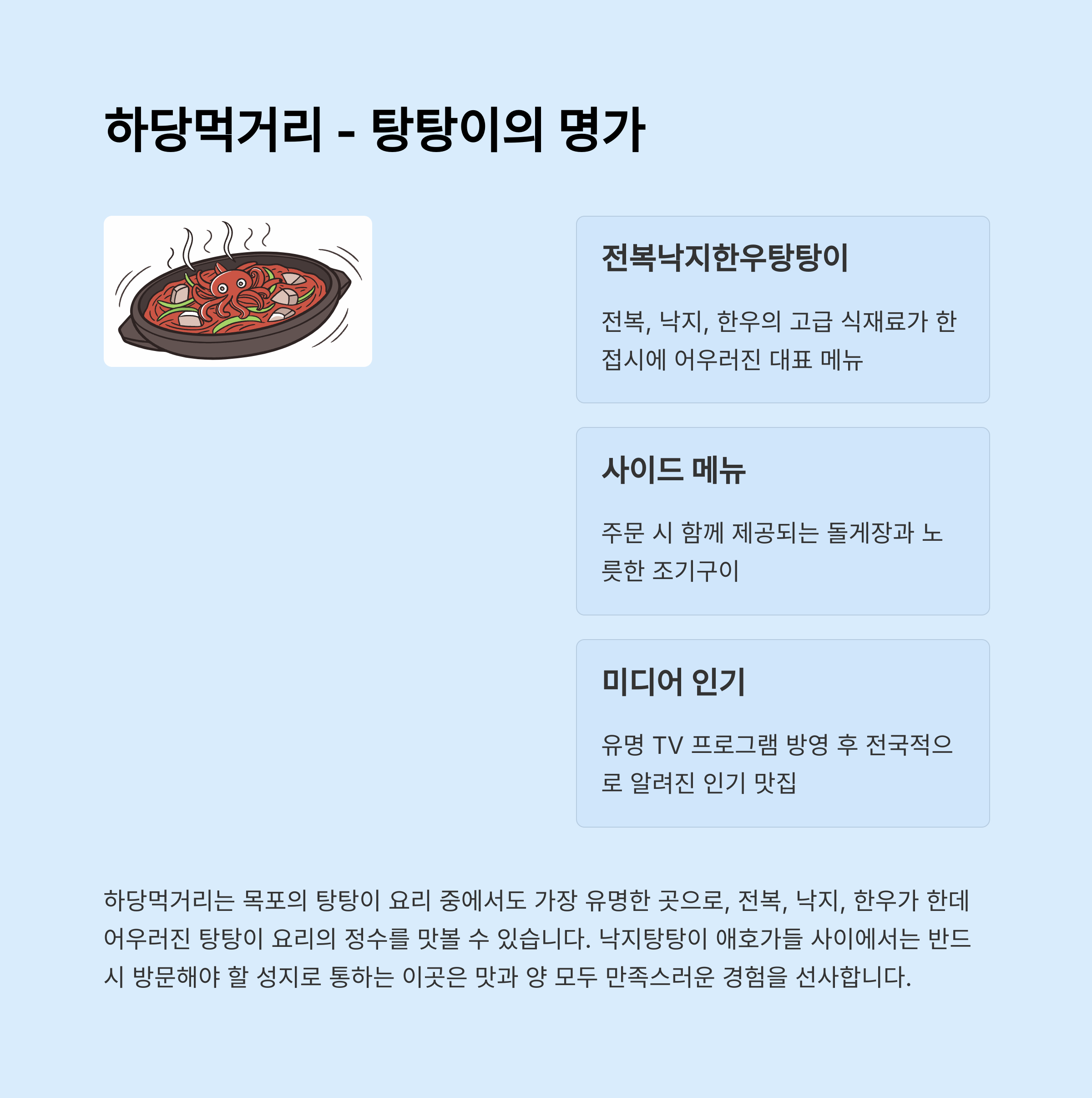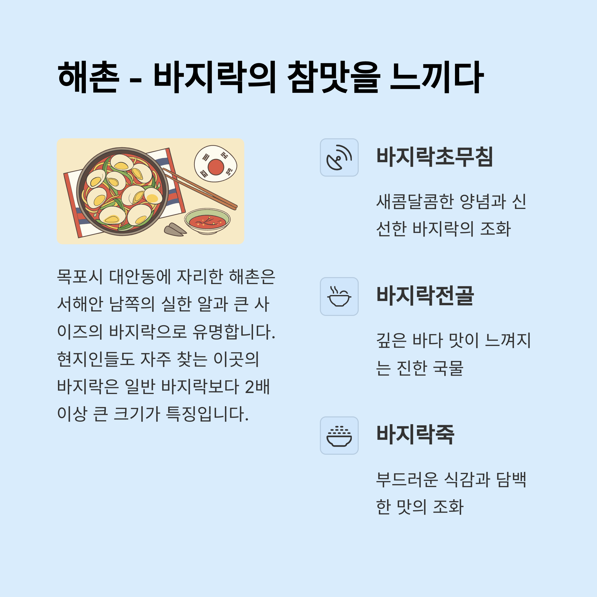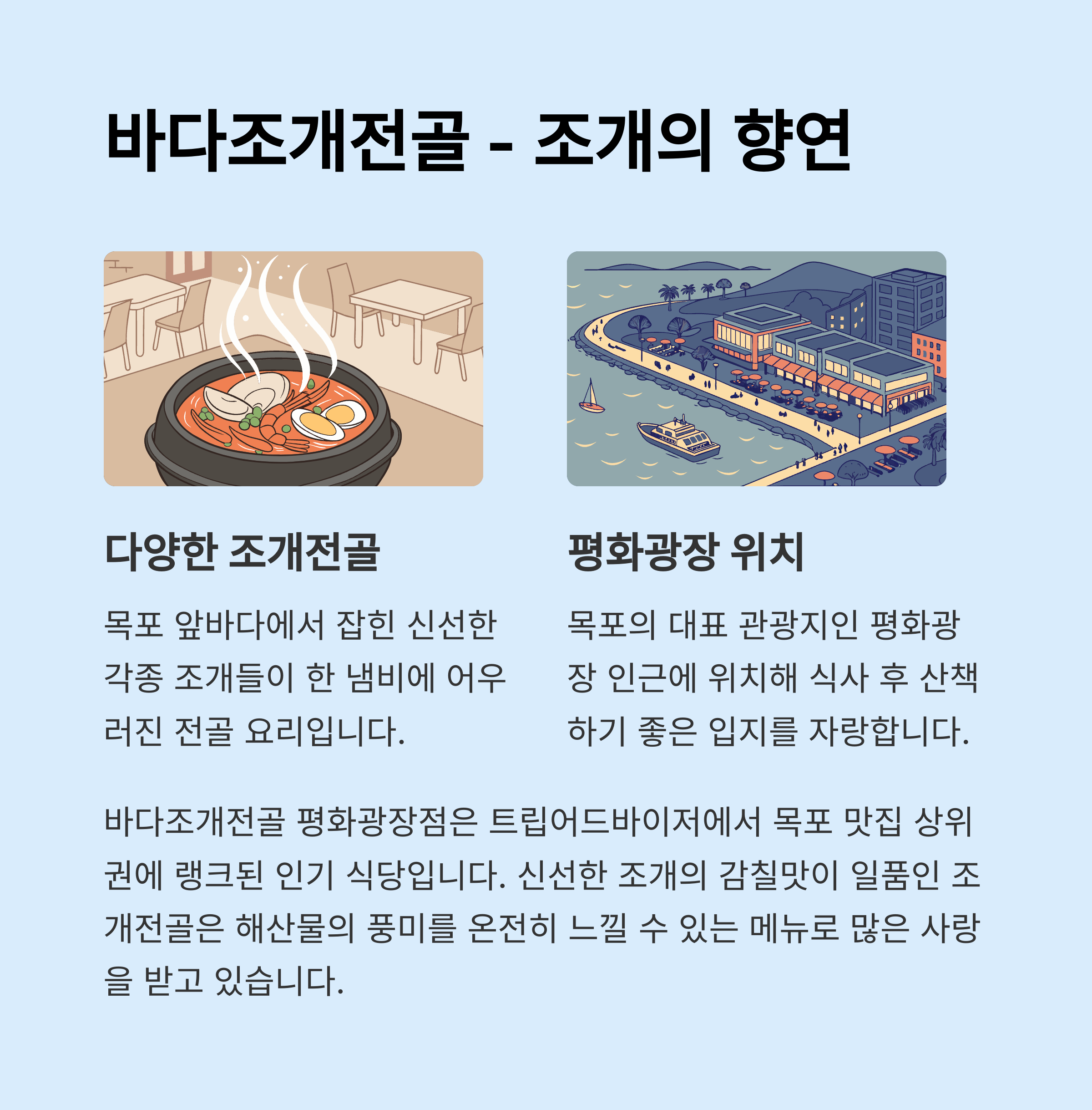 목포 해산물 요리는 다양하고 신선하며, 각각의 맛집들은 자신만의 개성을 갖추고 있습니다.