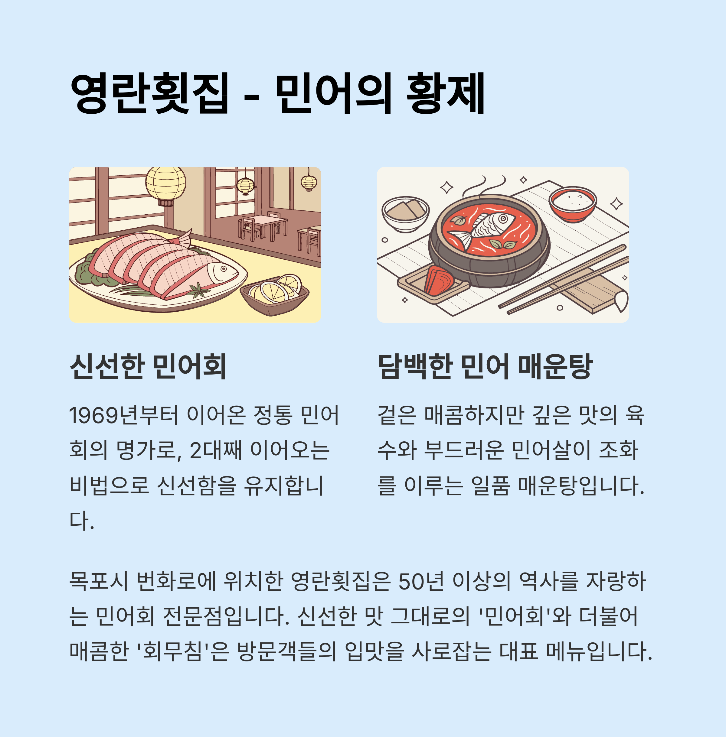 그 중에서도 영란횟집의 민어 회와 매운탕은 담백함과 신선함으로 인상적인 맛을 자랑합니다.