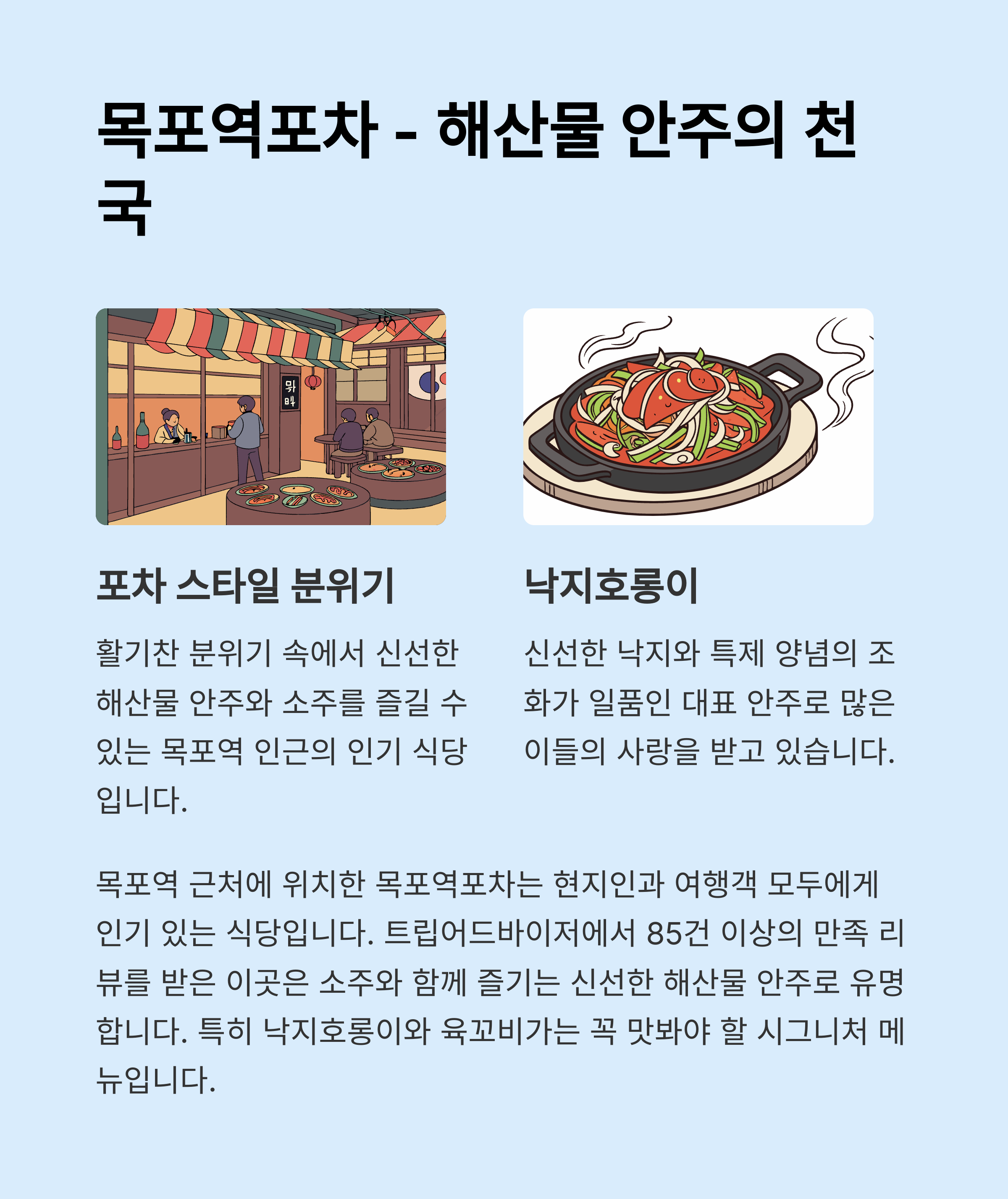 목포역포차는 해산물 안주와 소주를 함께 즐기는 포차 스타일로, 친근한 분위기가 돋보입니다.