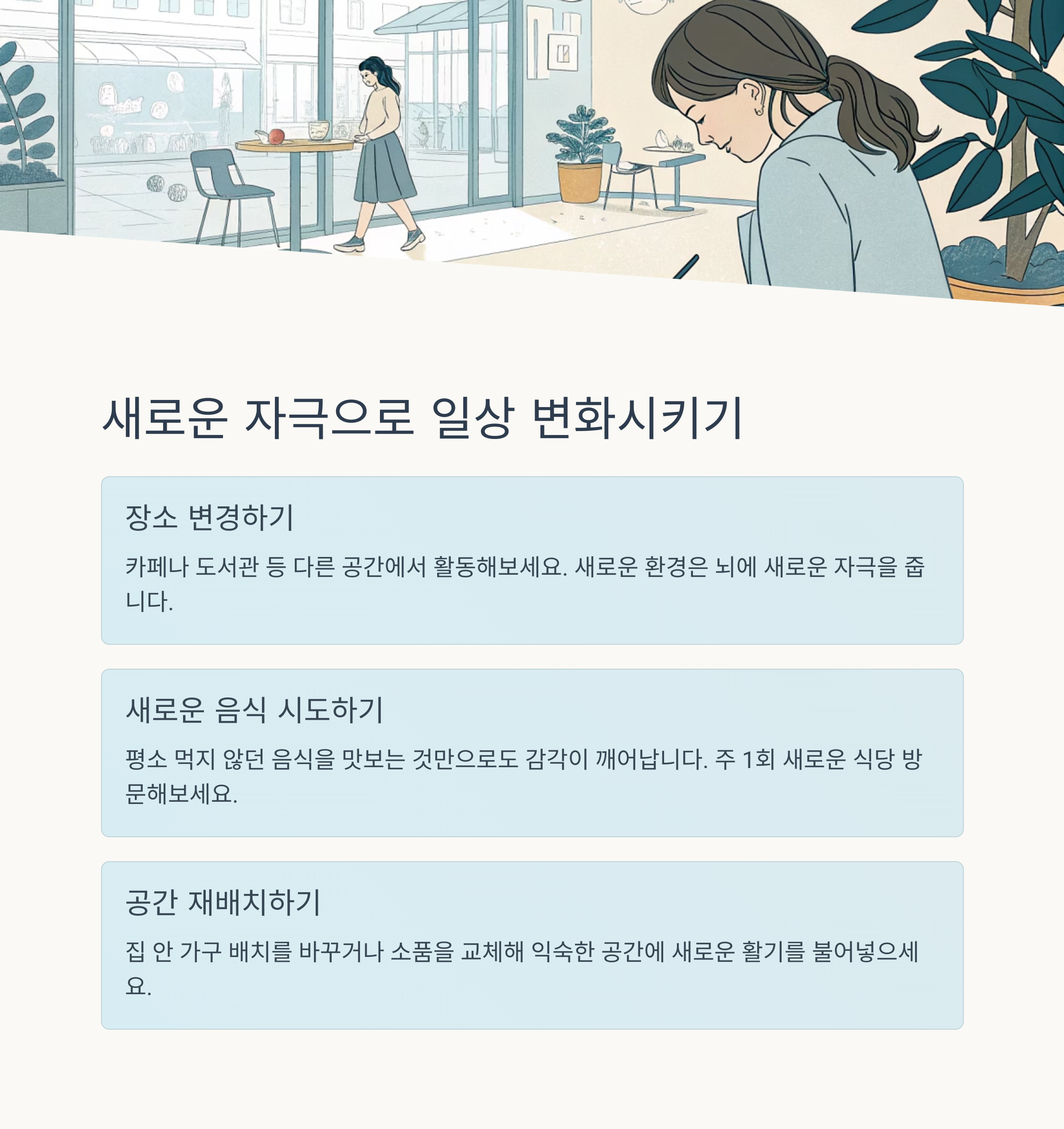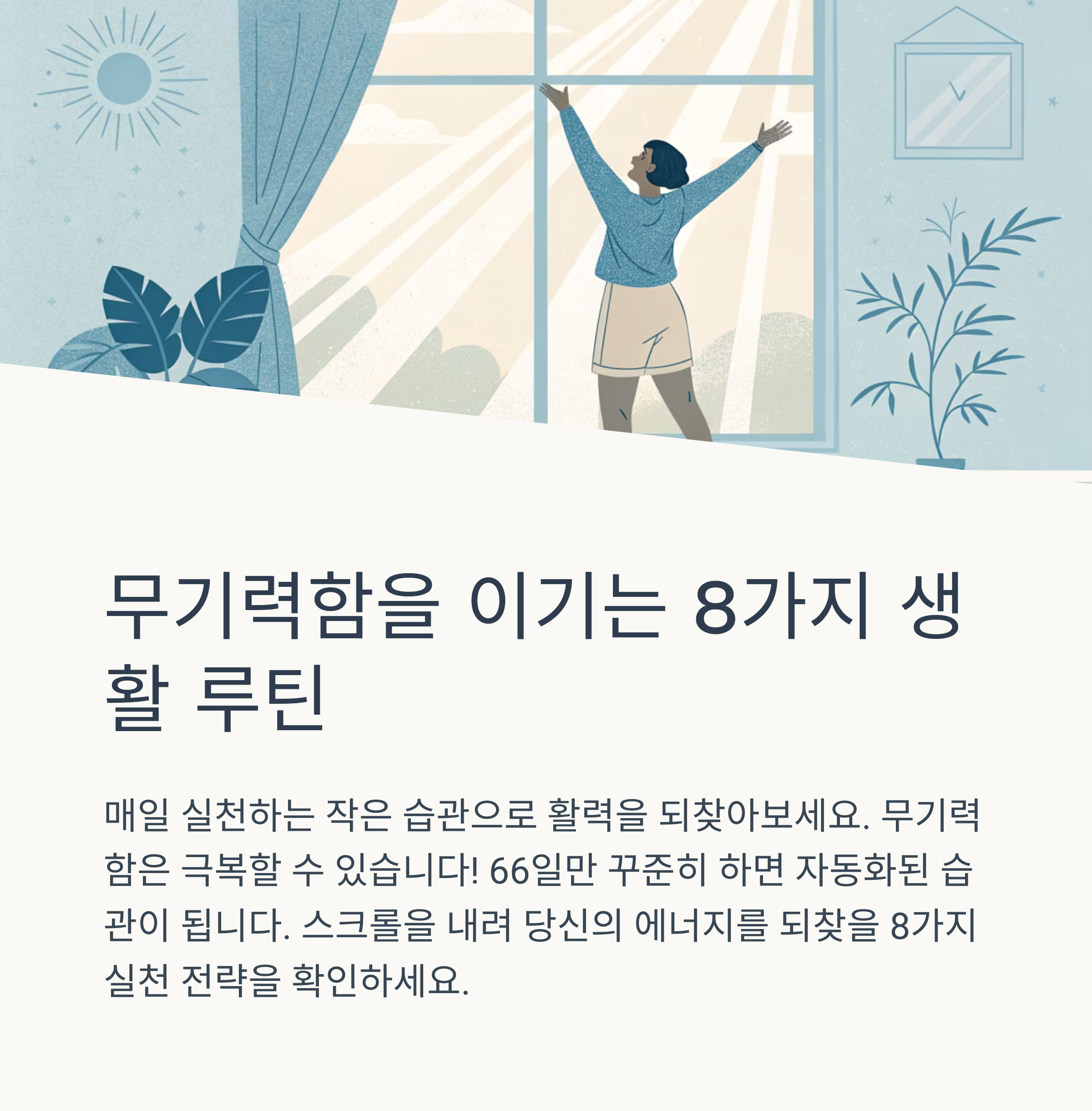 무엇보다 매일의 규칙적인 루틴을 유지하는 것이 무기력 탈출의 기본입니다.