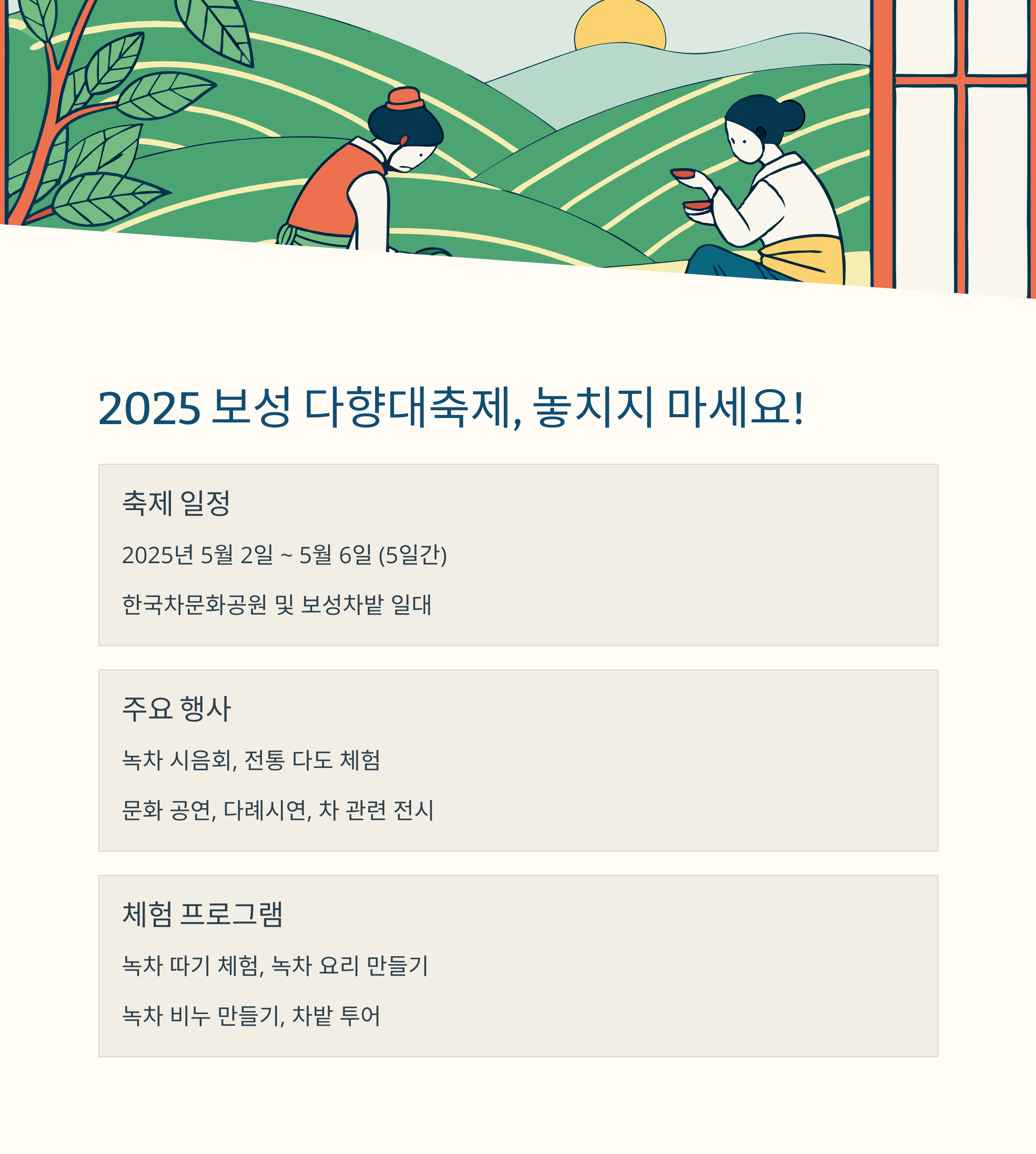 매년 5월에 열리는 보성 다향대축제에서는 다양한 프로그램과 차 문화를 즐길 수 있습니다.