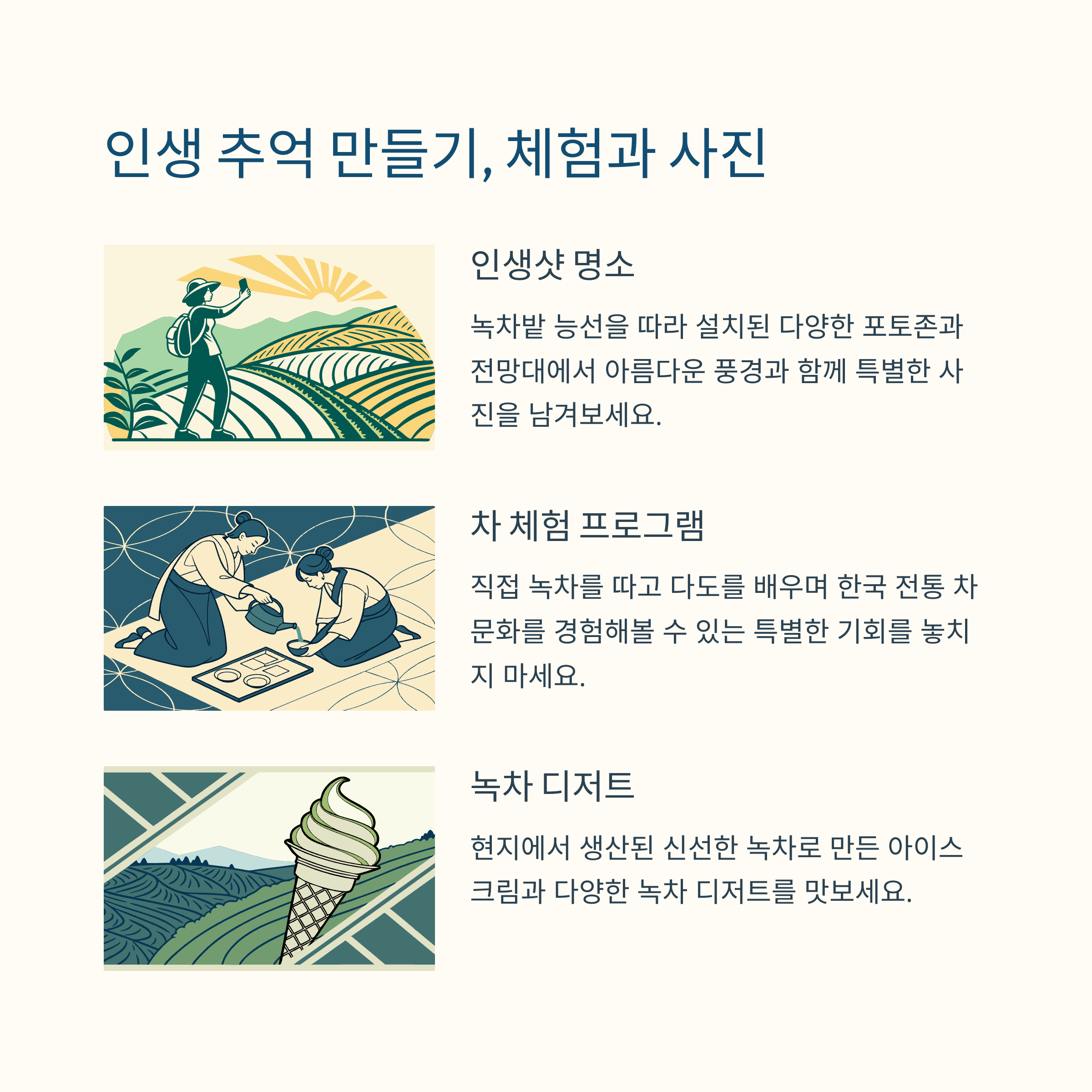 녹차를 직접 수확하고 체험할 수 있는 기회를 제공하여 특별한 경험을 선사합니다.