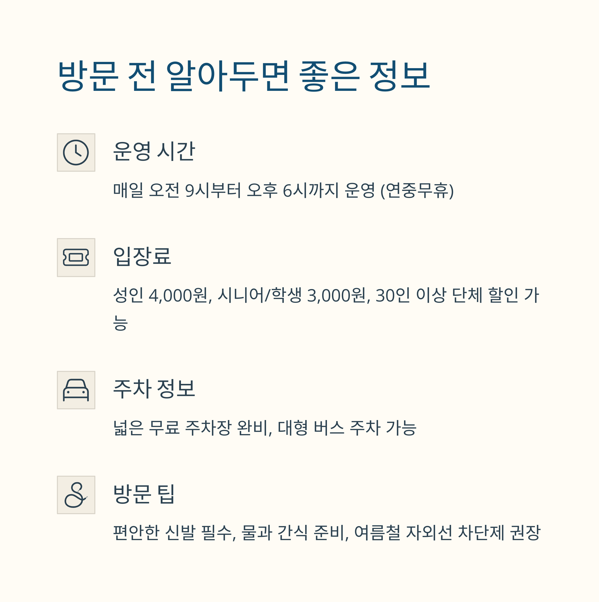 | 비 올 가능성 | 택시 추천 | 산책 및 체험 | 감성적인 숙소 |