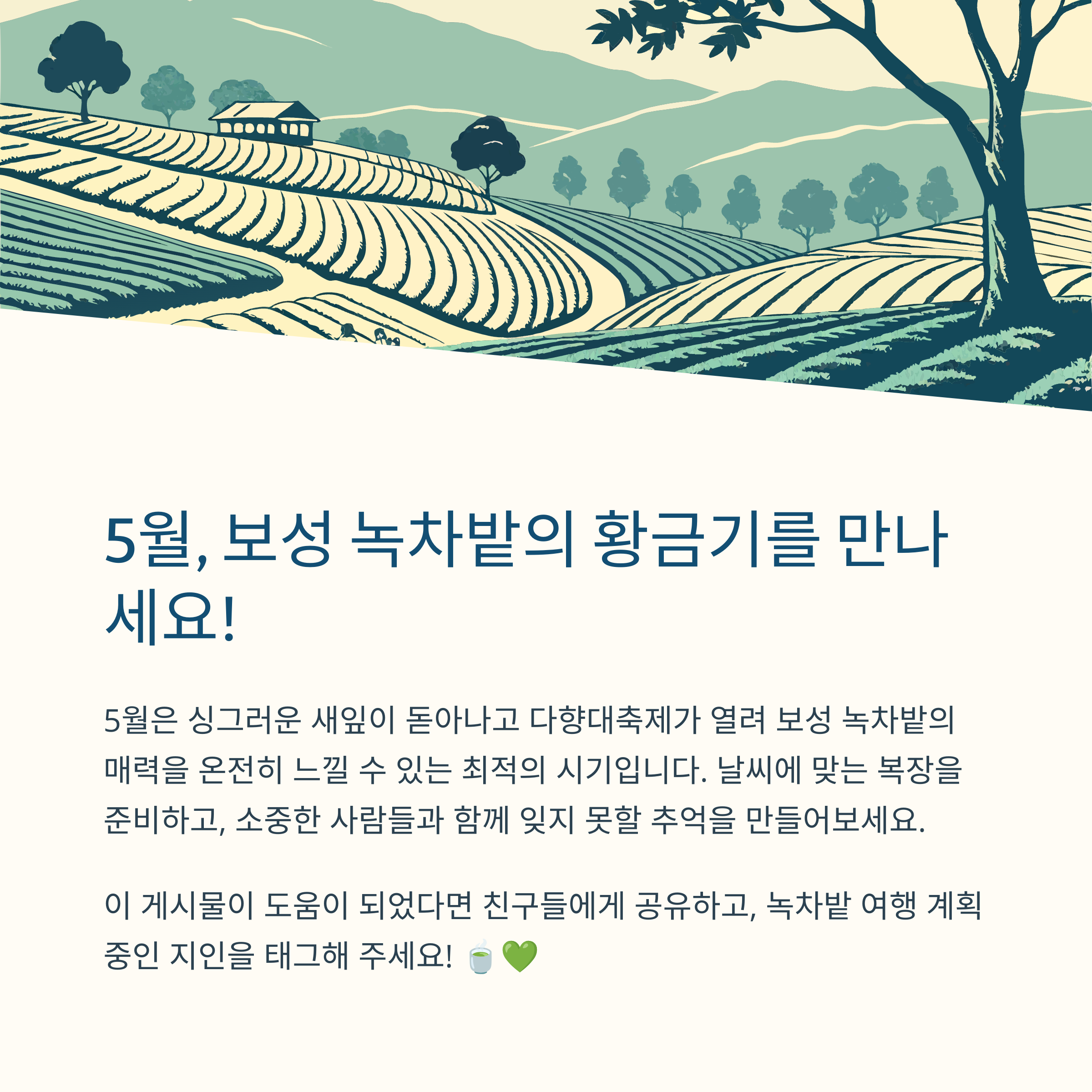 | 5월은 보성의 녹차밭을 방문하기에 가장 좋은 시기입니다. 관광객이 적은 기간이기 때문에 사진을 찍기에도 적합합니다. 봄의 신선한 녹차를 수확하는 즐거움도 더해줍니다. 다양한 차 문화 체험이 열리는 다향대축제도 이 시기에 개최됩니다. 자연의 아름다움을 만끽하며 힐링할 수 있는 기회입니다. |