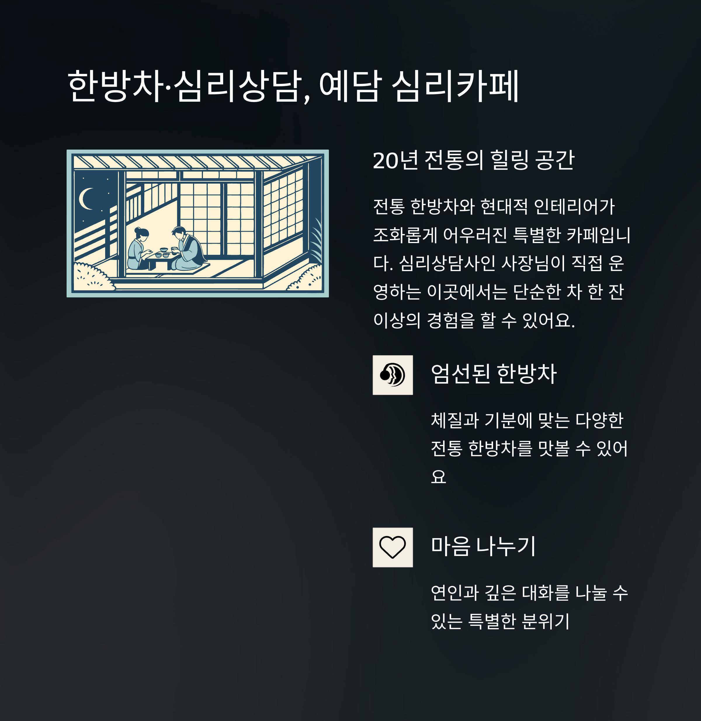 | 예담 심리카페 | 한방차로 마음 힐링 | 21:30 | 심리 상담 후 대화 나누기 |