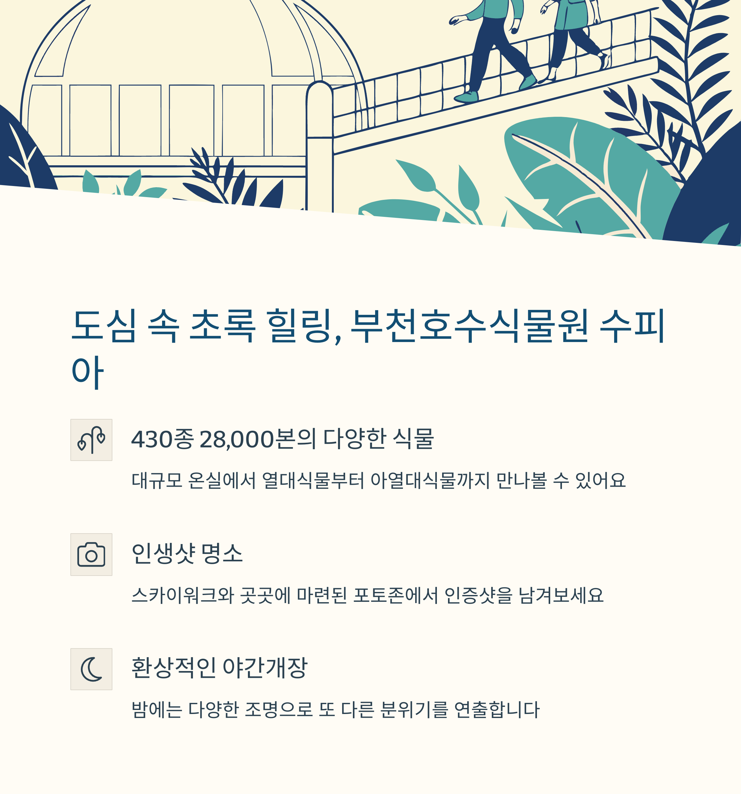 | 부천호수식물원 | 푸르른 자연과 책 읽는 카페 | 18:30-20:00 | 대화 및 사진 찍기 |