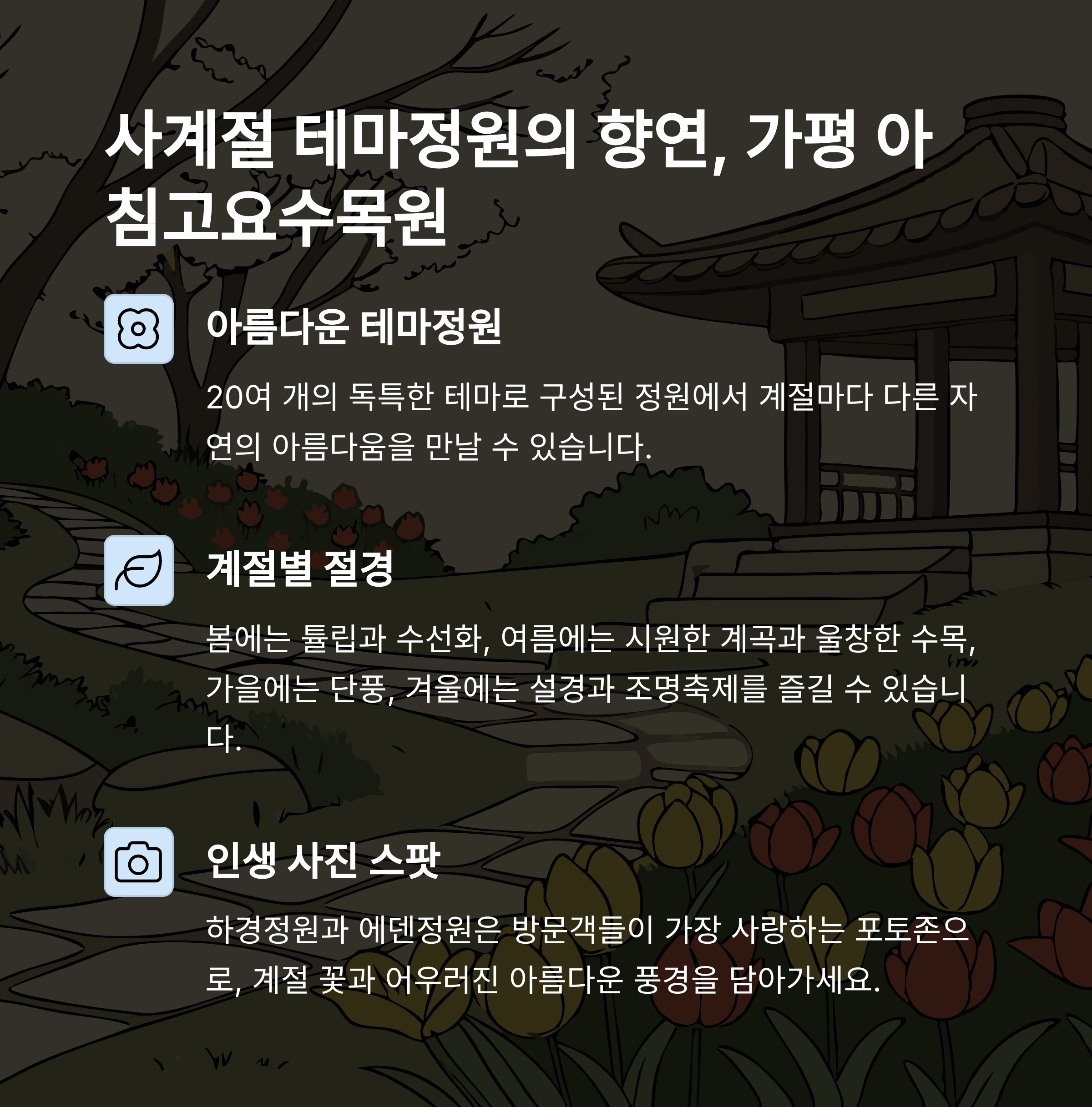 가평 아침고요수목원과 남양주 물의정원 등 다양한 명소에서 새로운 활력을 찾을 수 있습니다.