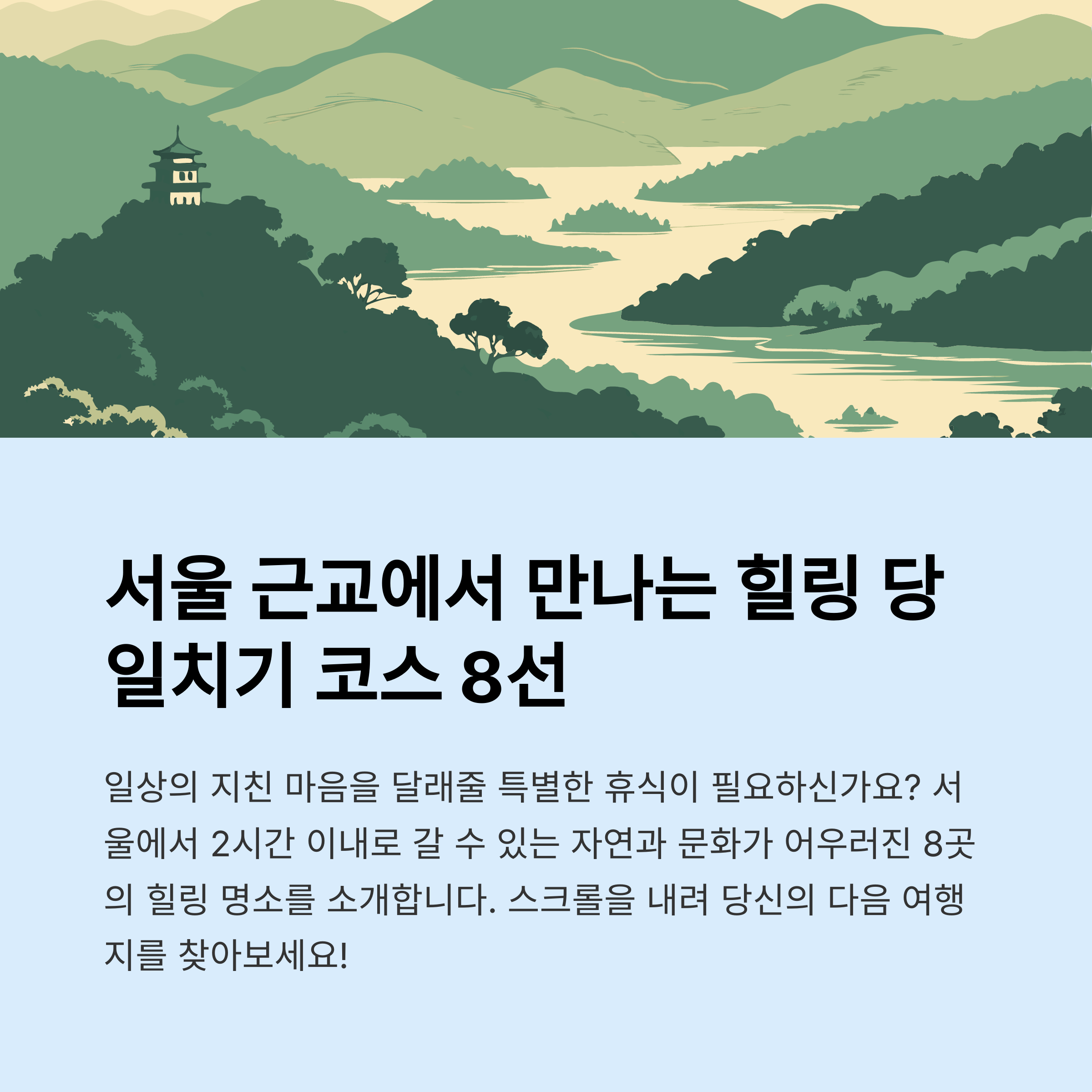 오늘은 서울 근교에서 즐길 수 있는 당일치기 힐링 코스를 소개해 드리겠습니다.