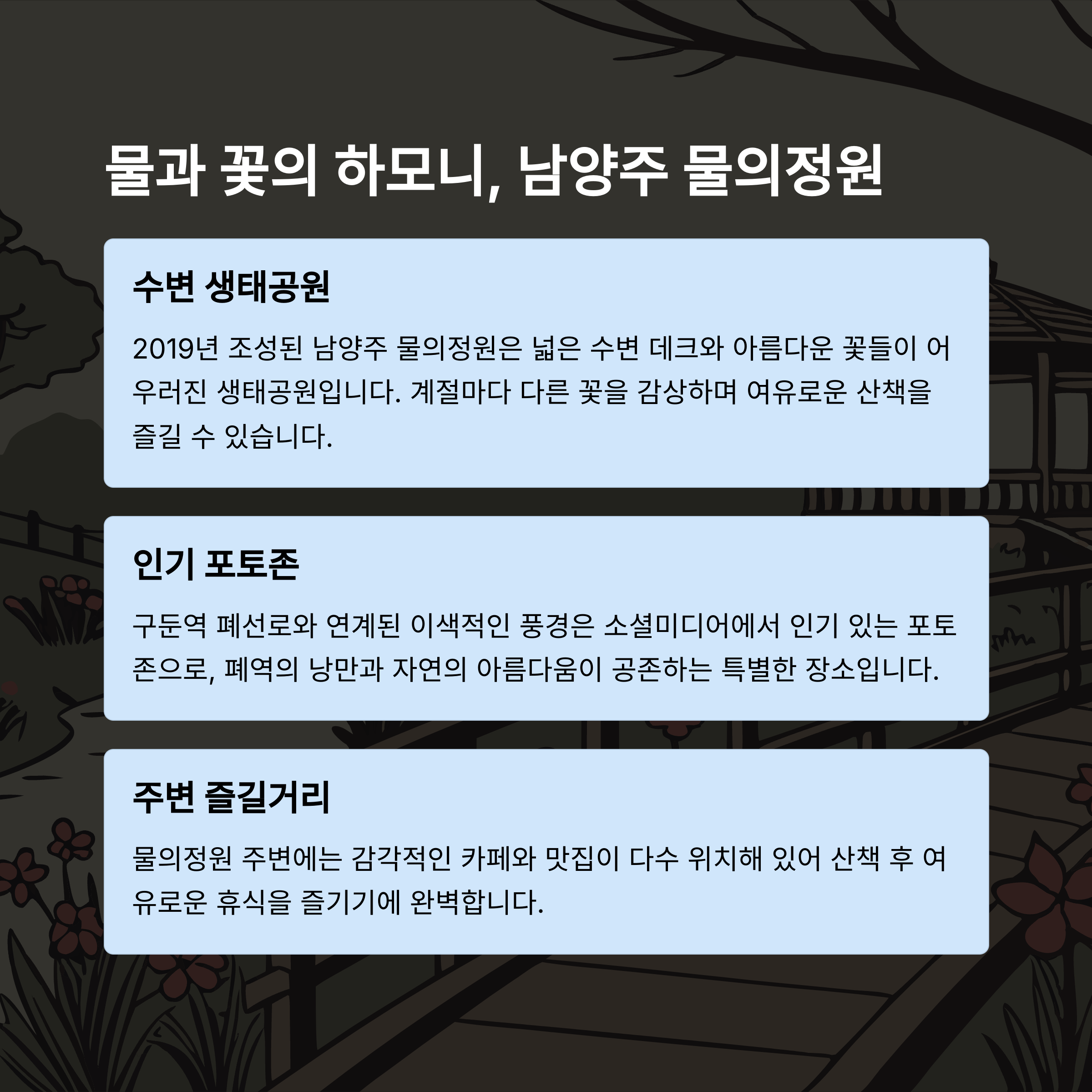 | Q. 남양주 물의정원과 구둔역 폐선로는 어떤 점이 매력적일까요? |