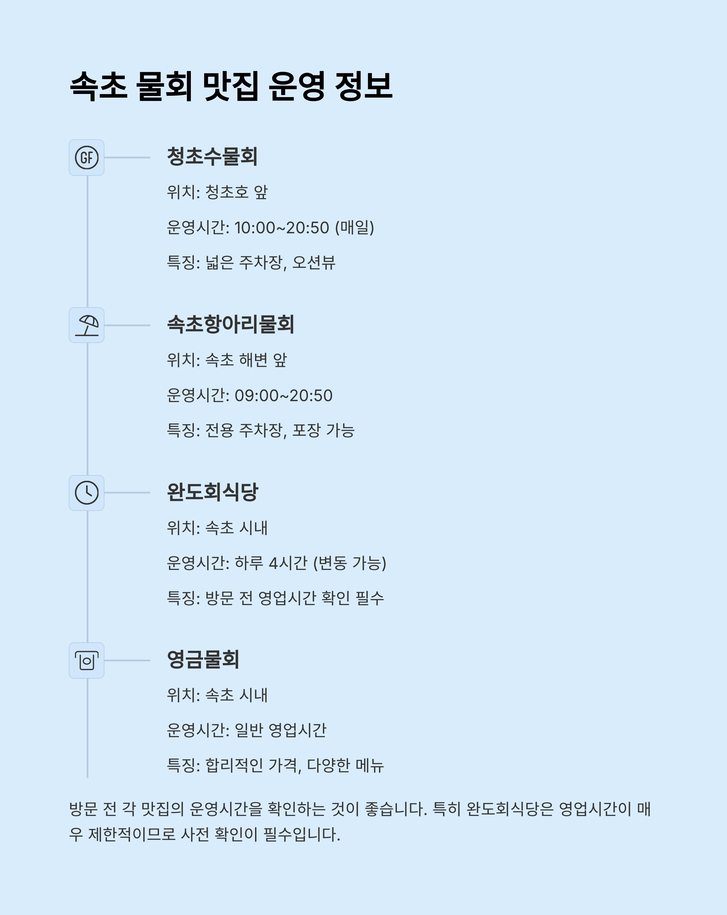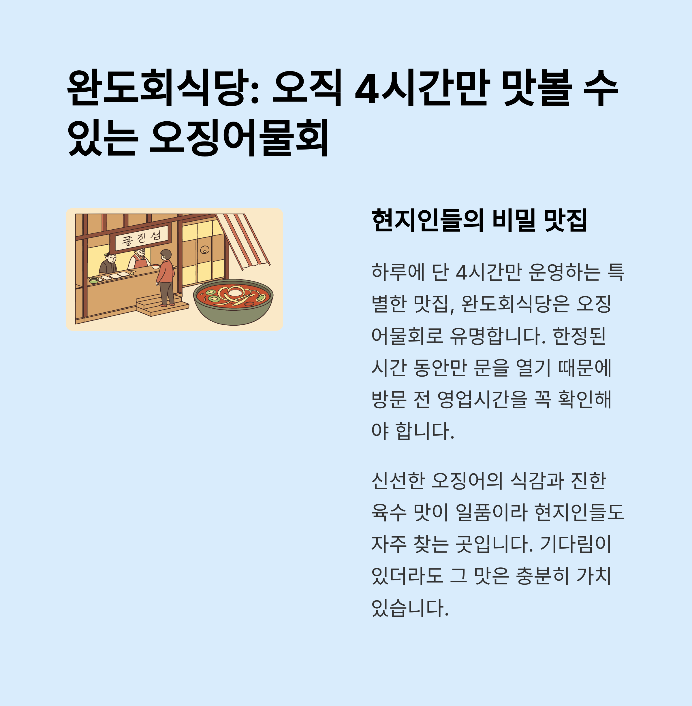 | 완도회식당 | 속초 내 (주소 불명) | 하루 4시간 | 오징어물회 |