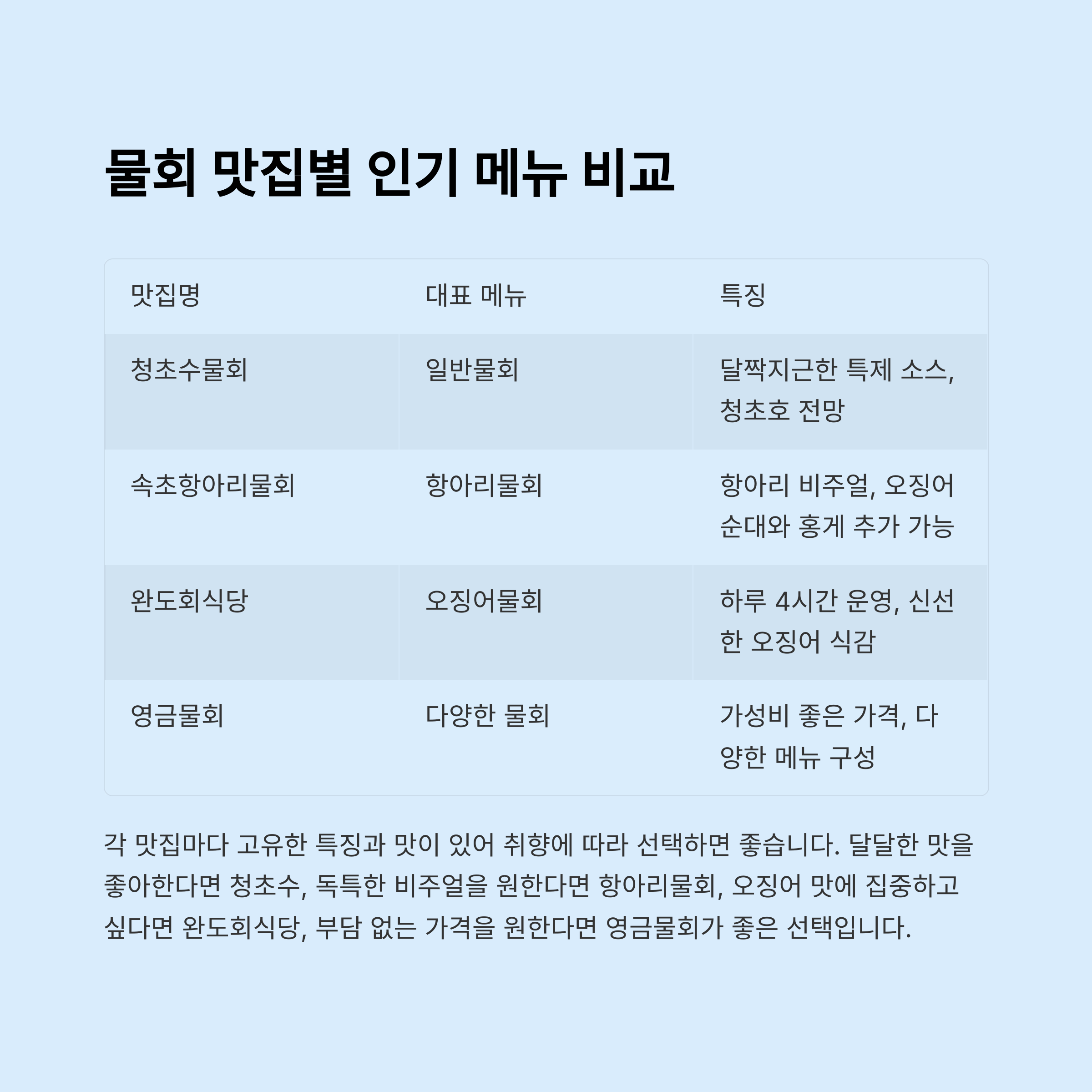 청초수물회와 속초항아리물회는 특히 관광객들 사이에서 높은 인기를 보입니다.
