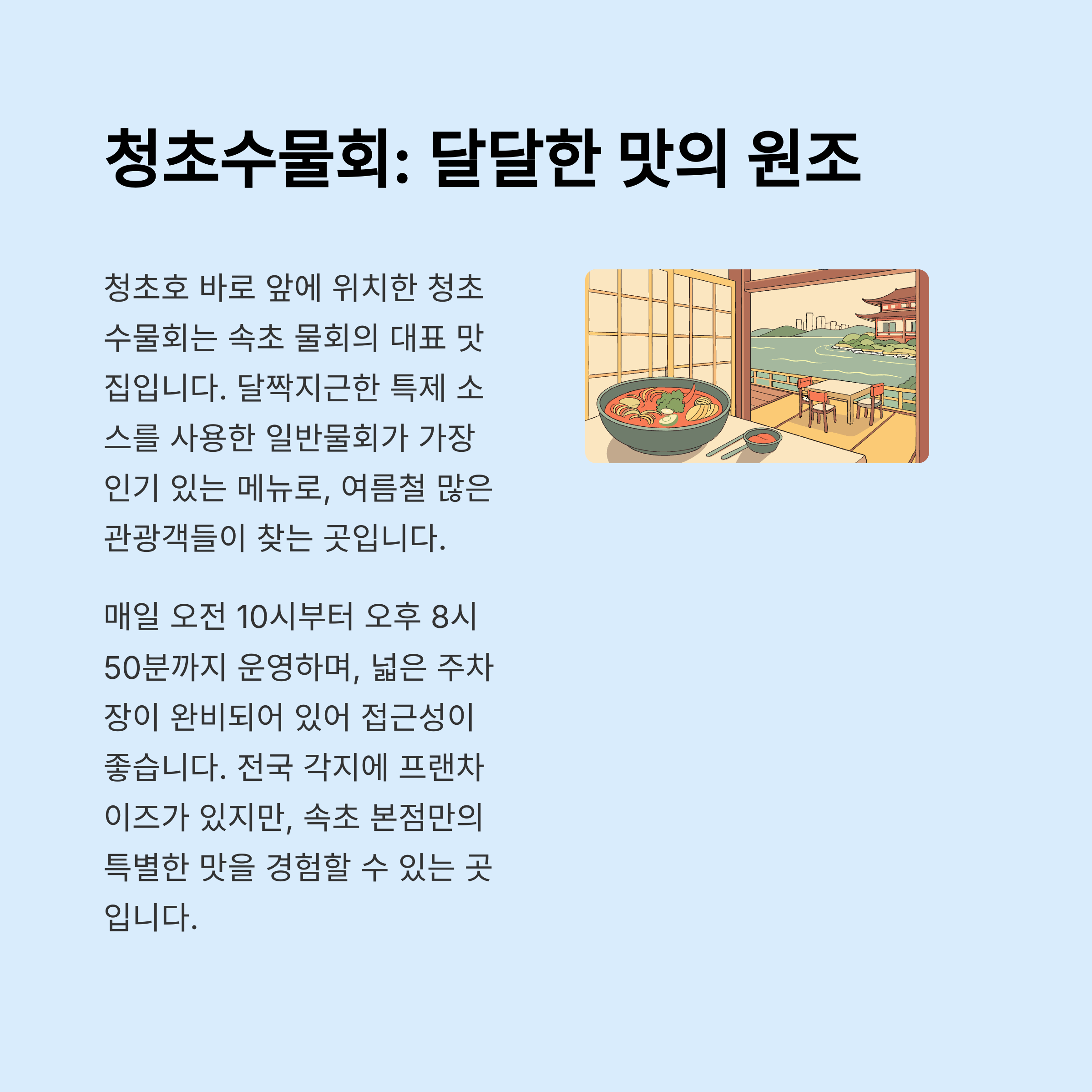| 청초수물회 | 속초시 엑스포로 12-36 | 매일 10시 - 20시 50분 | 일반물회 |