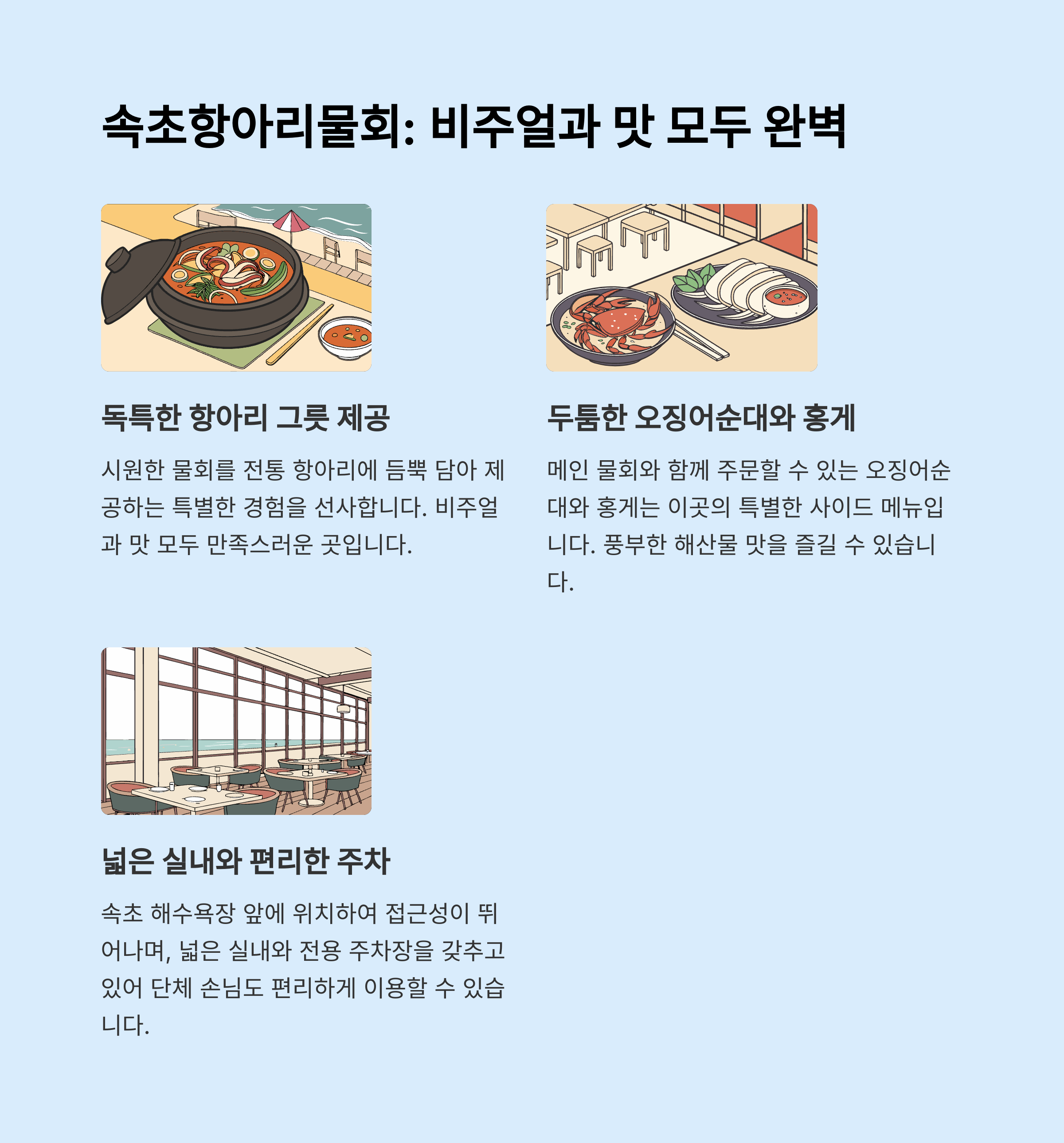 또 다른 인기 맛집인 속초항아리물회는 차가운 물회를 항아리에 담아 제공하여 신선도를 극대화했습니다.