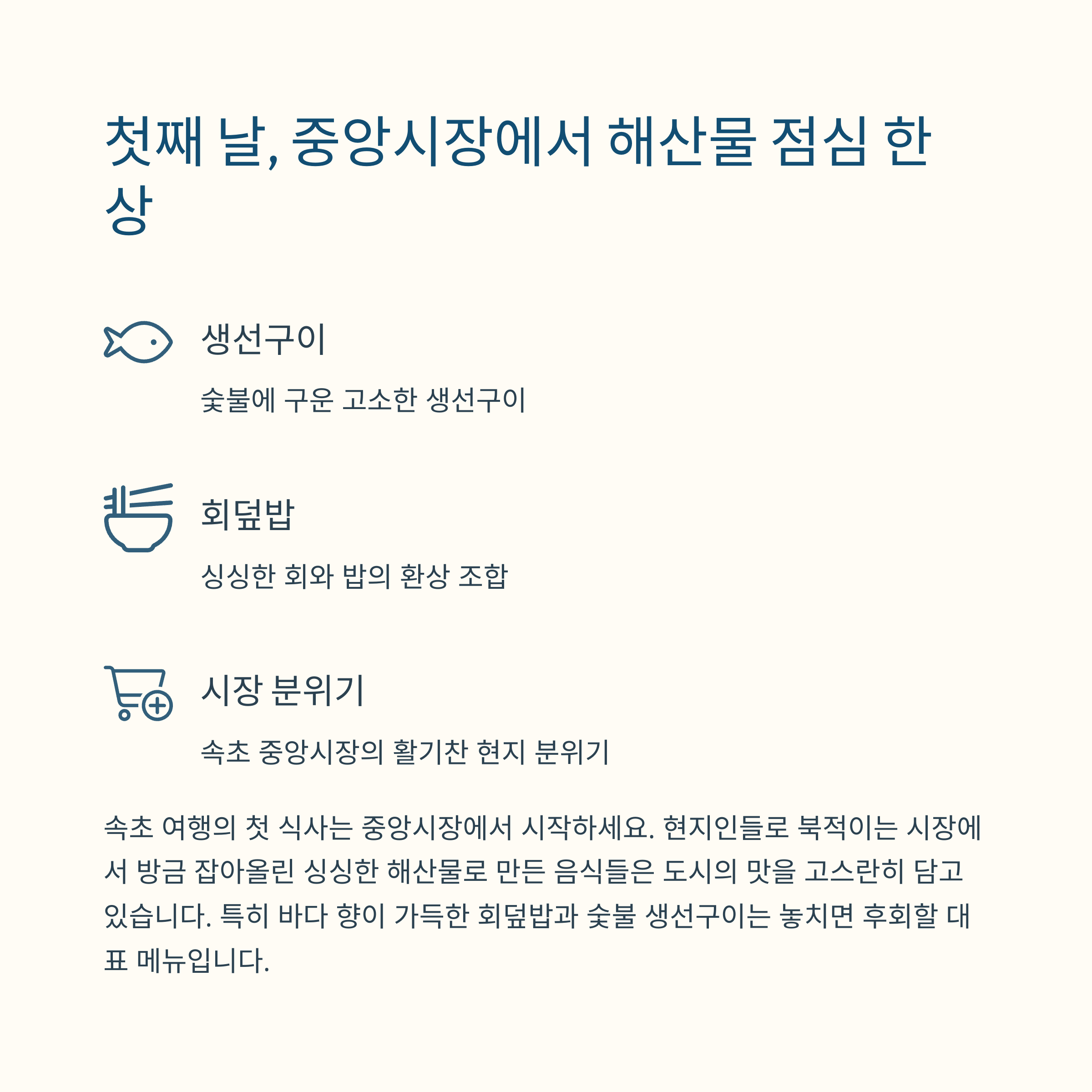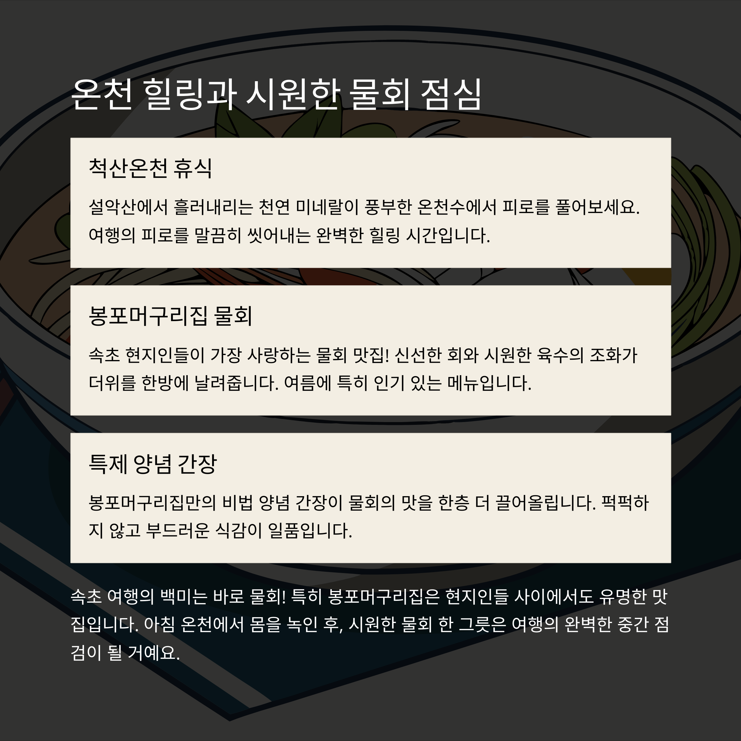 여행의 즐거움과 더불어 맛과 멋이 함께하는 속초에서 완벽한 힐링을 경험하세요.