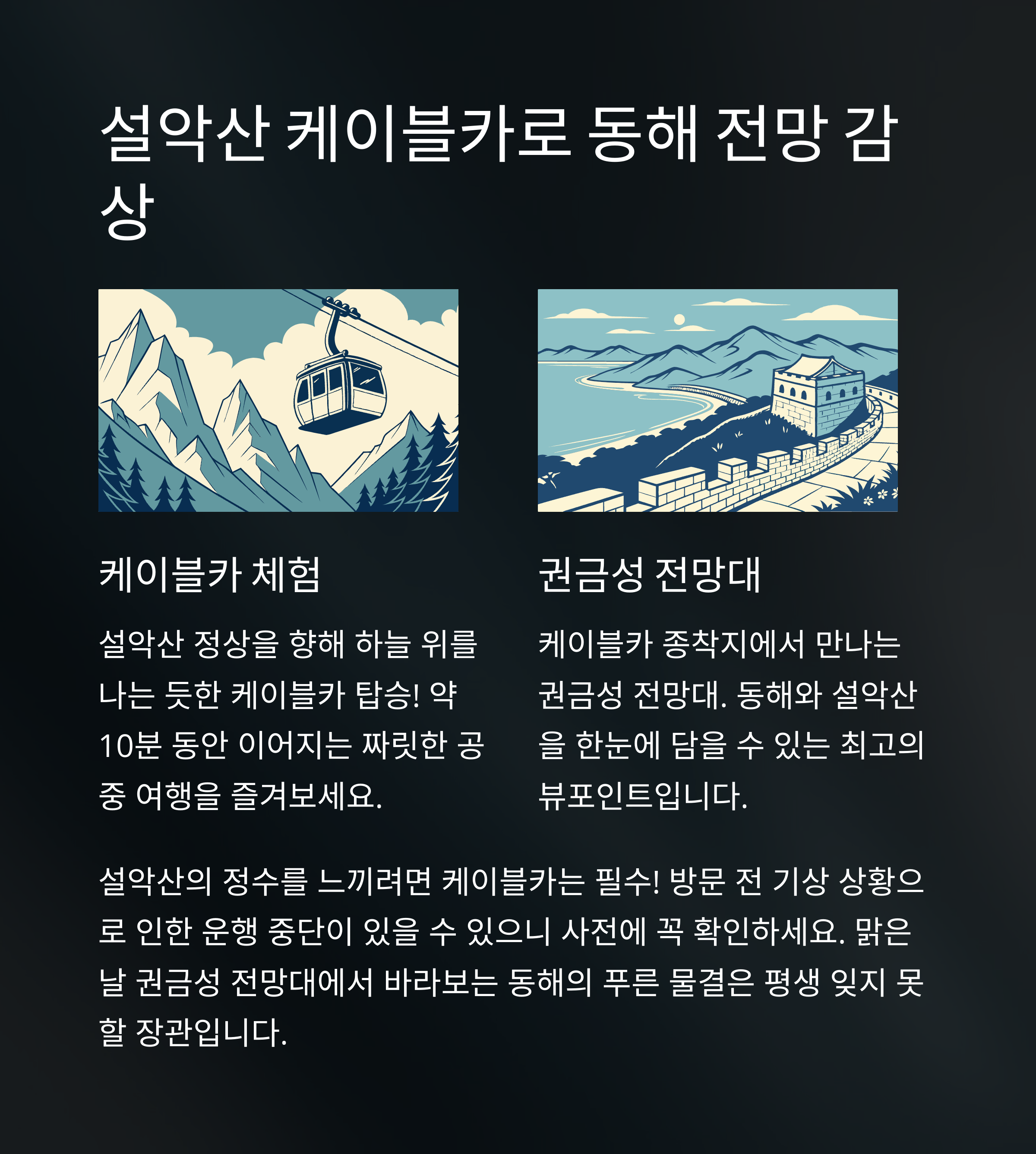 오후에는 설악산 국립공원으로 가서 케이블카를 타고 권금성의 전경을 감상하세요.