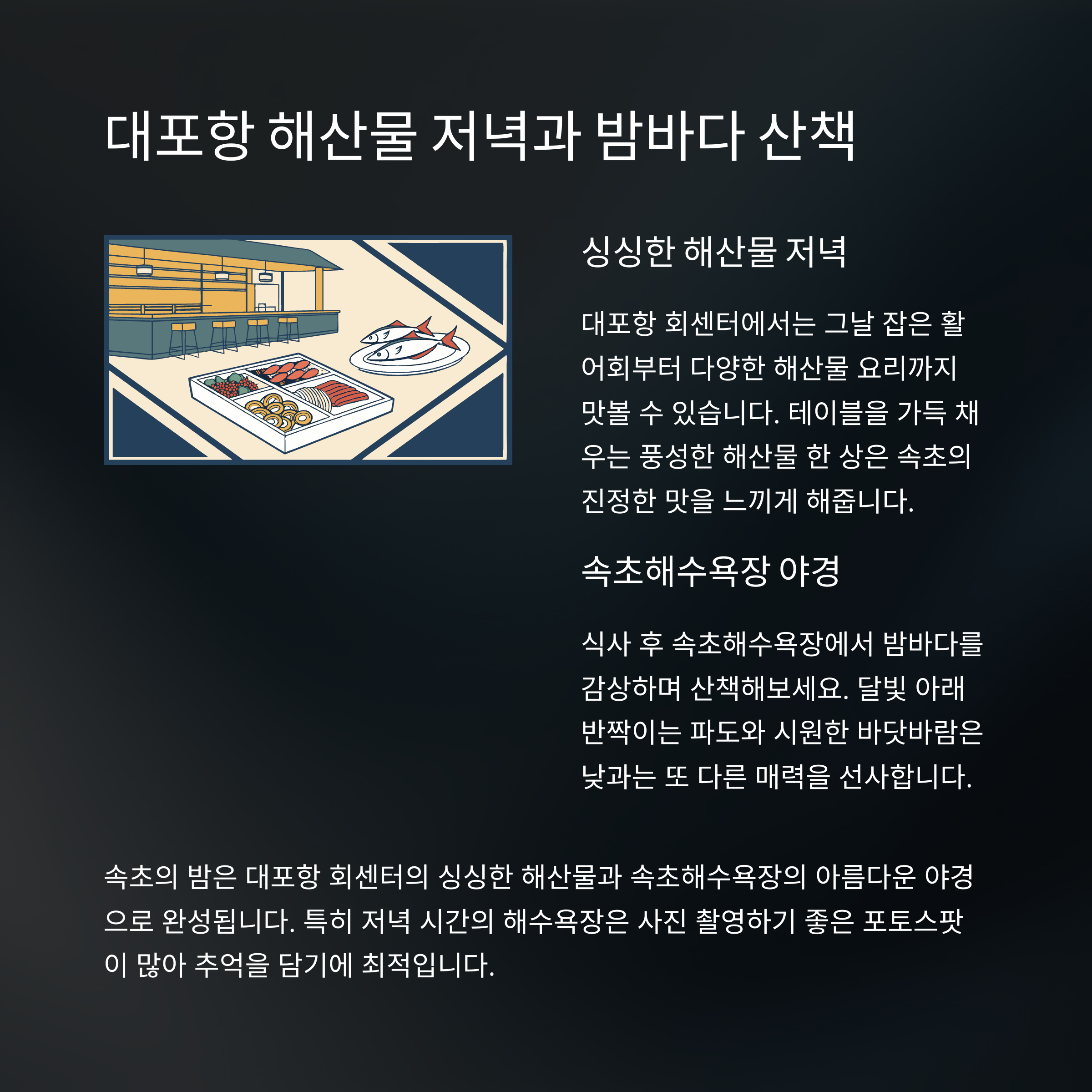 저녁 후에는 속초해수욕장의 야경을 걸으며 바다의 경치를 감상하는 것이 좋습니다.