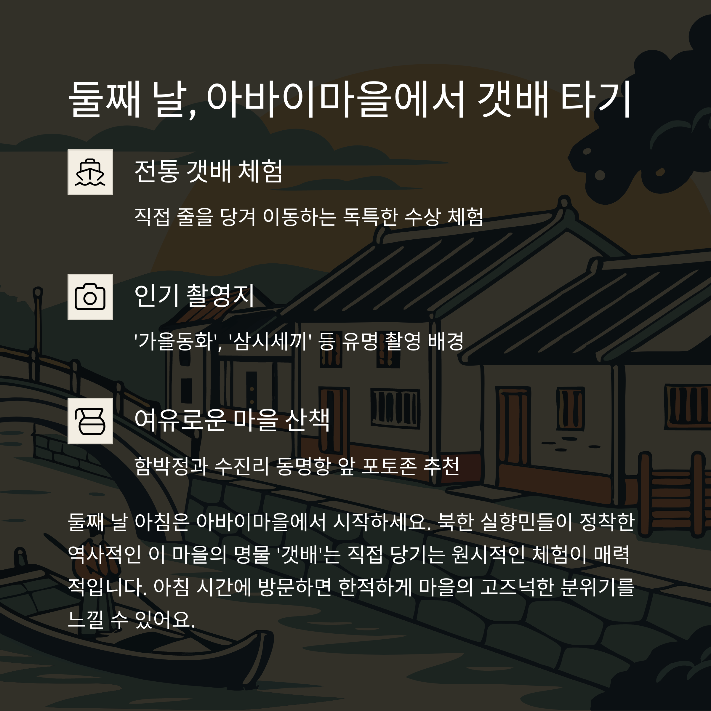 둘째 날에는 아바이마을의 갯배 체험으로 시작하세요.