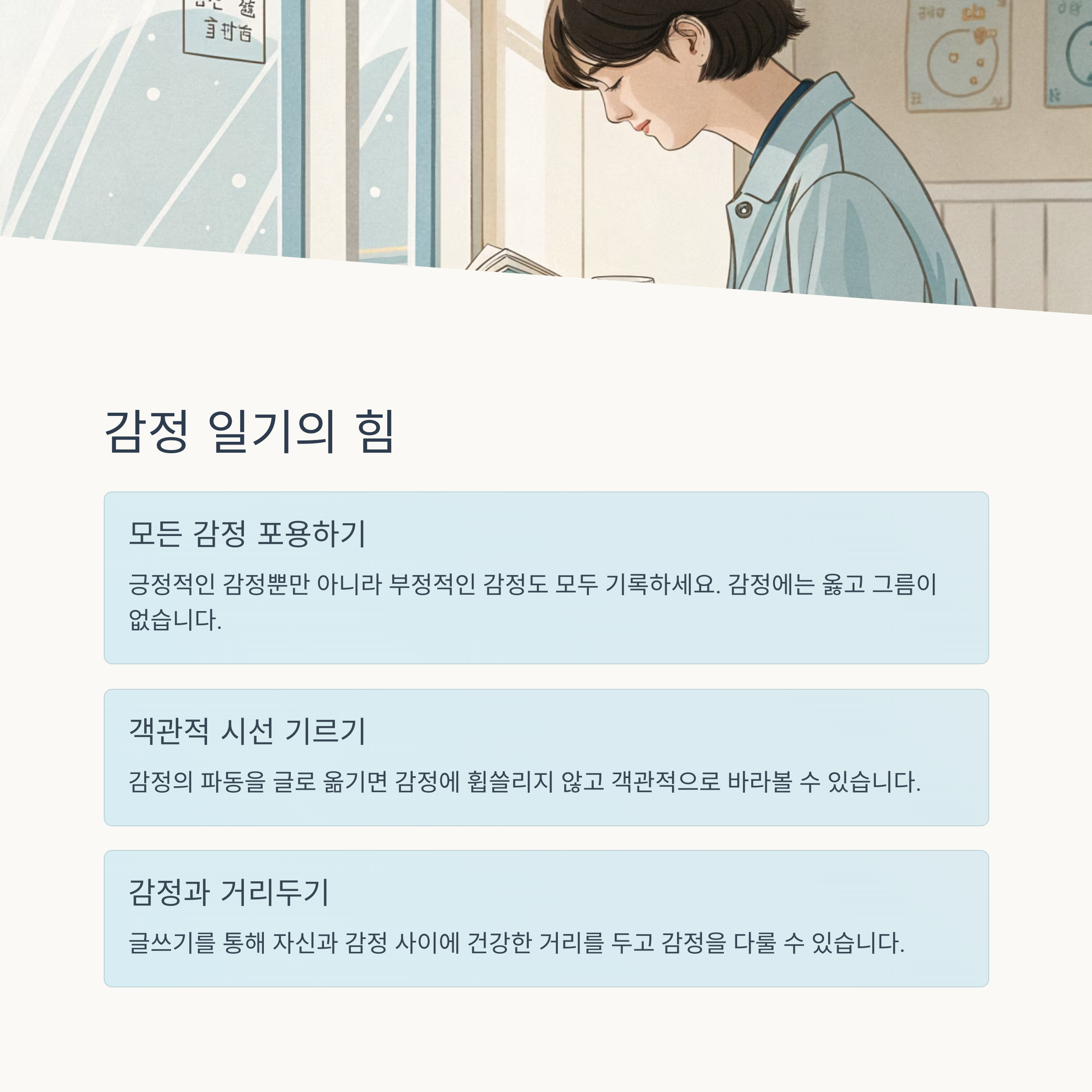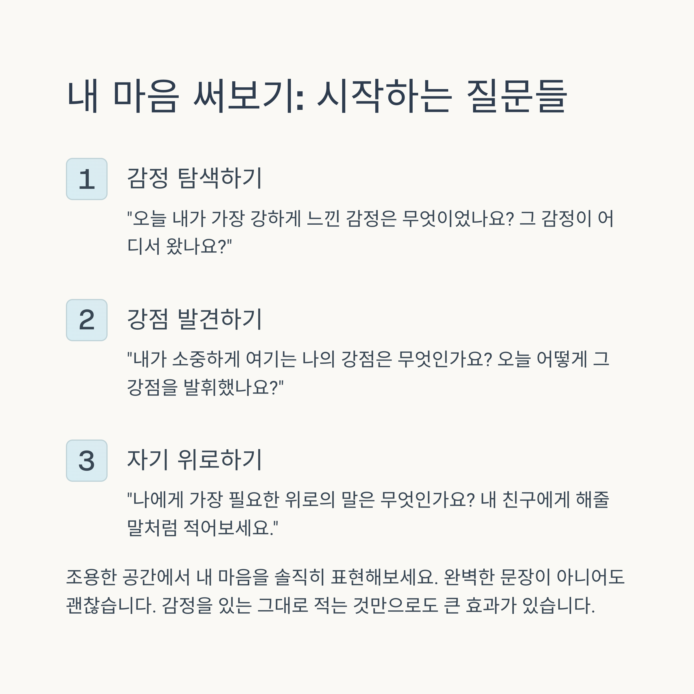 감정을 글로 적는 것은 내면의 혼란을 가라앉히고, 스스로를 바라보는 시각을 변화시킬 수 있습니다.