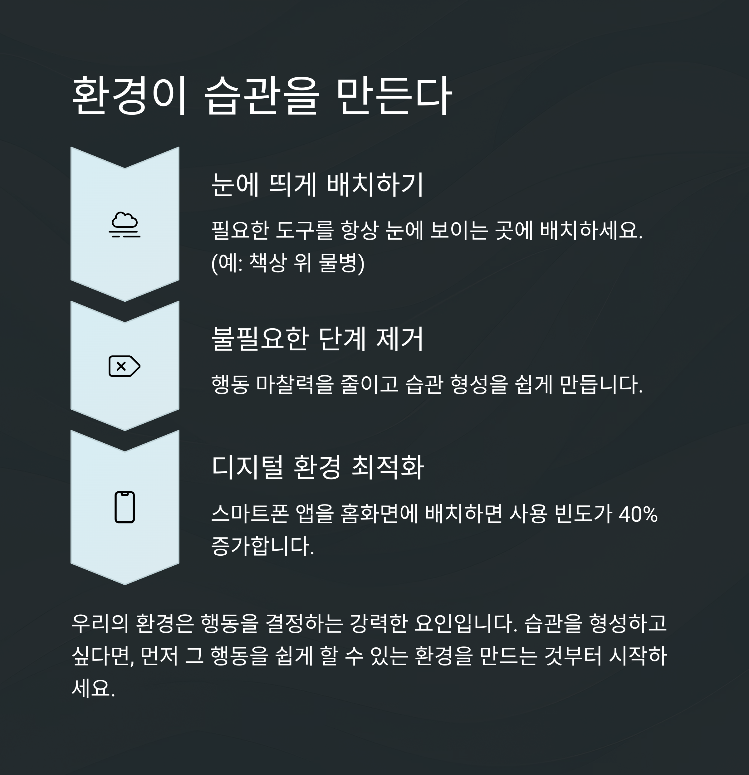 마찰을 줄이는 환경을 조성하는 것도 중요한데, 이는 습관 형성의 효과를 크게 향상시킬 수 있습니다.