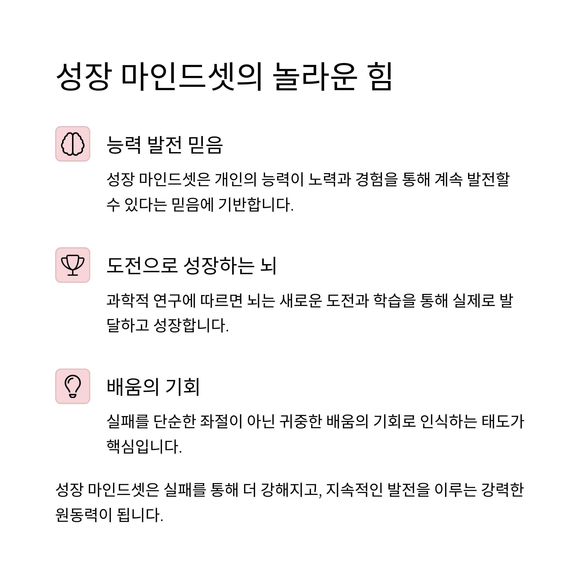 성장 마인드셋을 통해 어떻게 실패를 긍정적으로 바꾸고, 이를 통해 더 나은 방향으로 나아갈 수 있는지 알아보겠습니다.