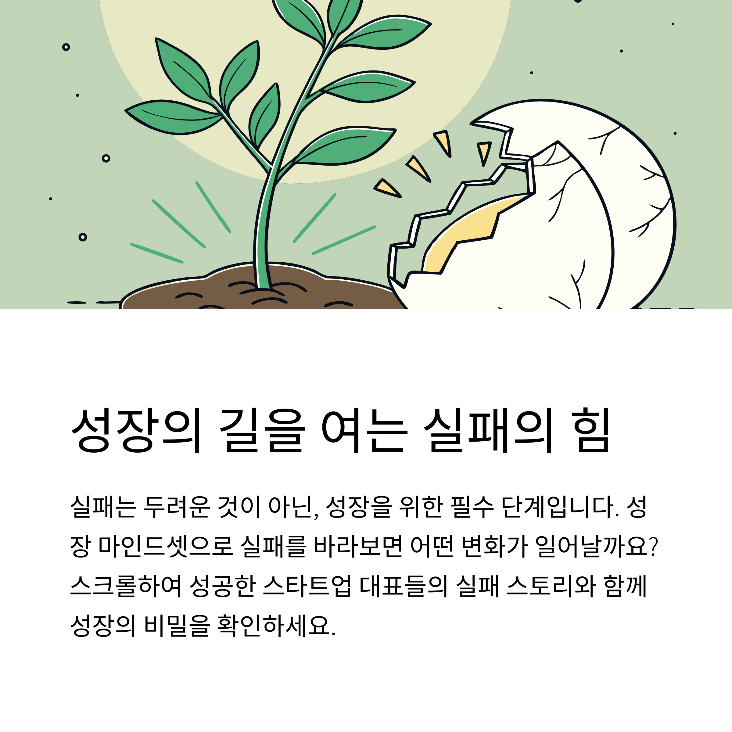 | 실패의 가치를 이해하는 것은 성장의 시작입니다. 성장 마인드셋을 통해 우리는 실패를 교훈으로 삼을 수 있습니다. 실패는 회복탄력성을 키우는 중요한 과정입니다. 성공적인 기업가들은 실패를 통해 배우고 성장해 나갑니다. 이러한 과정을 통해 우리는 인내심과 긍정적 마인드를 기를 수 있습니다. |