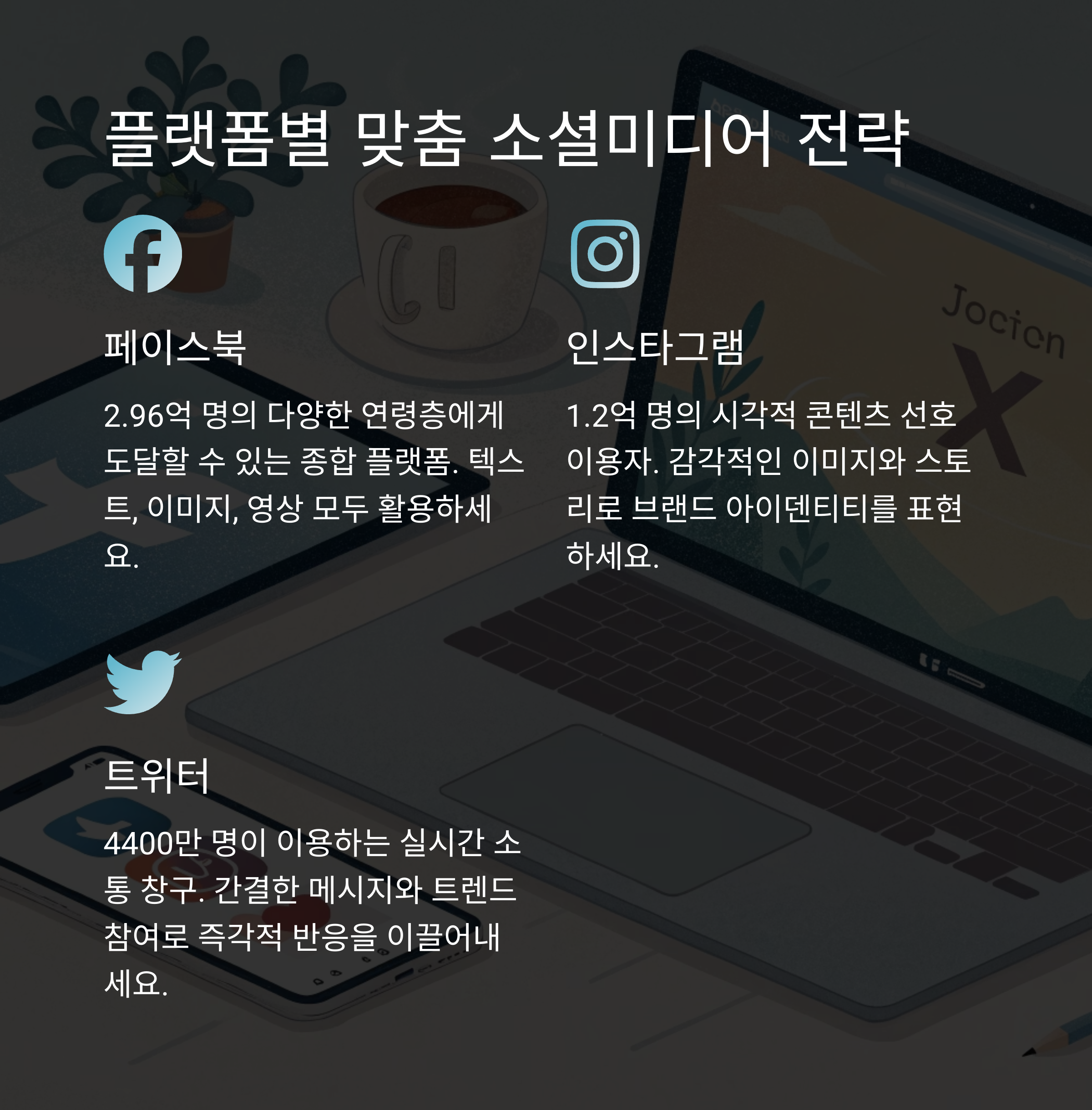 | 인스타그램 | 1.2억 명 | 비주얼 중심 콘텐츠 | 제품 이미지 홍보 |