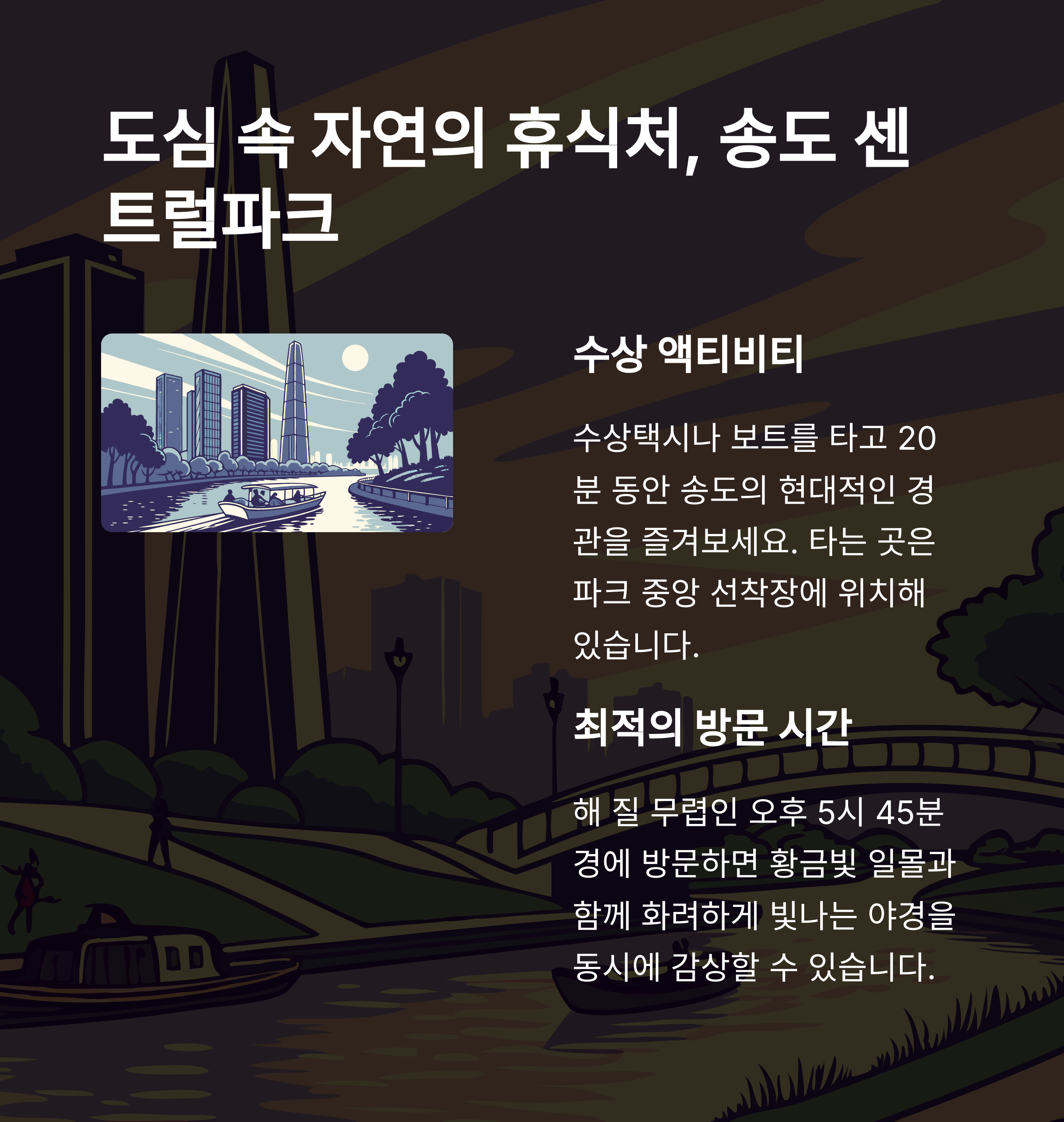 또한, 송도 센트럴파크에서 저녁 노을을 보며 하루를 마무리하는 시간을 가지면 좋습니다.