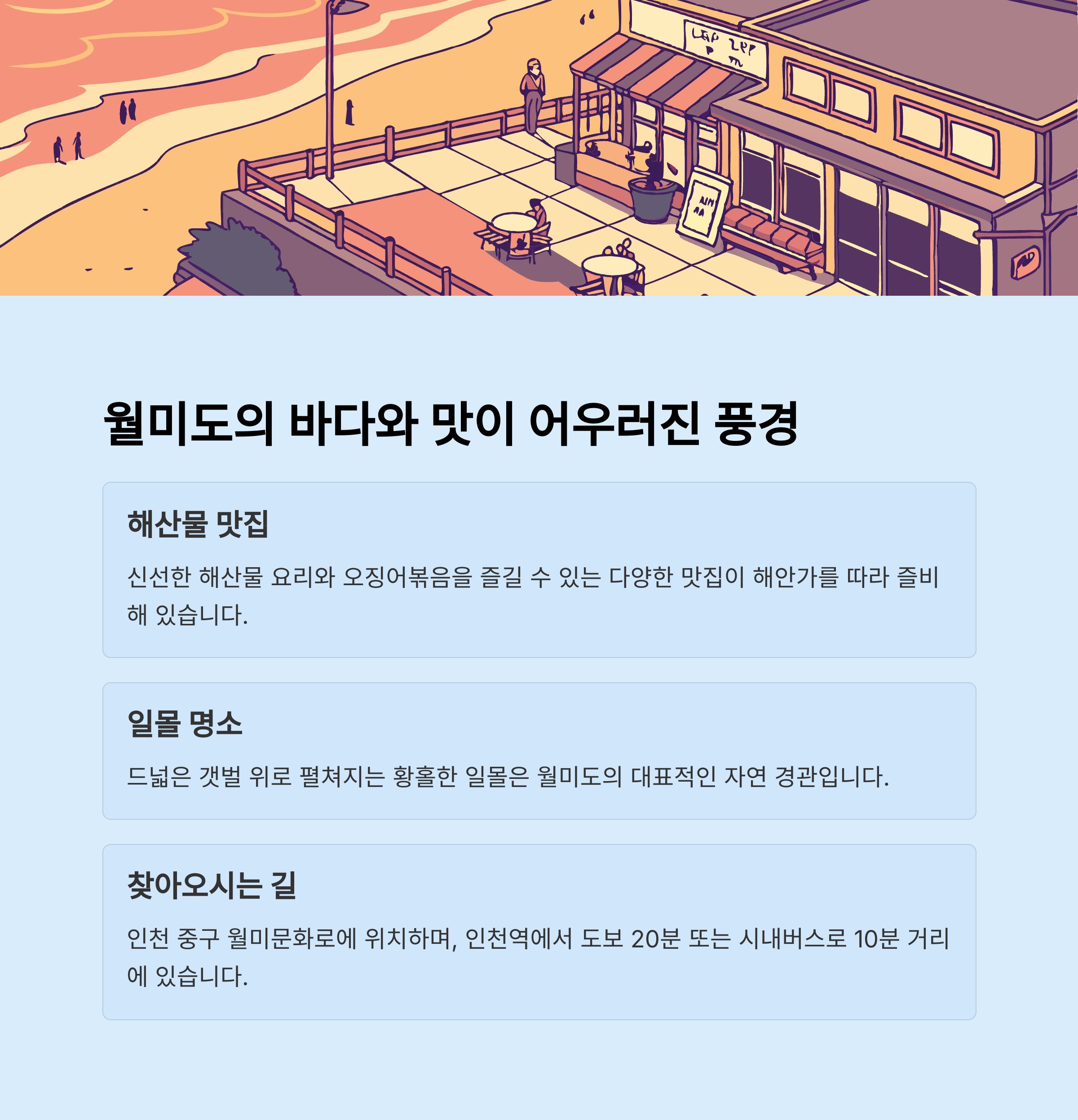 인천의 매력은 바다에서 시작됩니다. 월미도에서 시원한 바람을 맞으며 다양한 해산물 요리를 즐기세요.