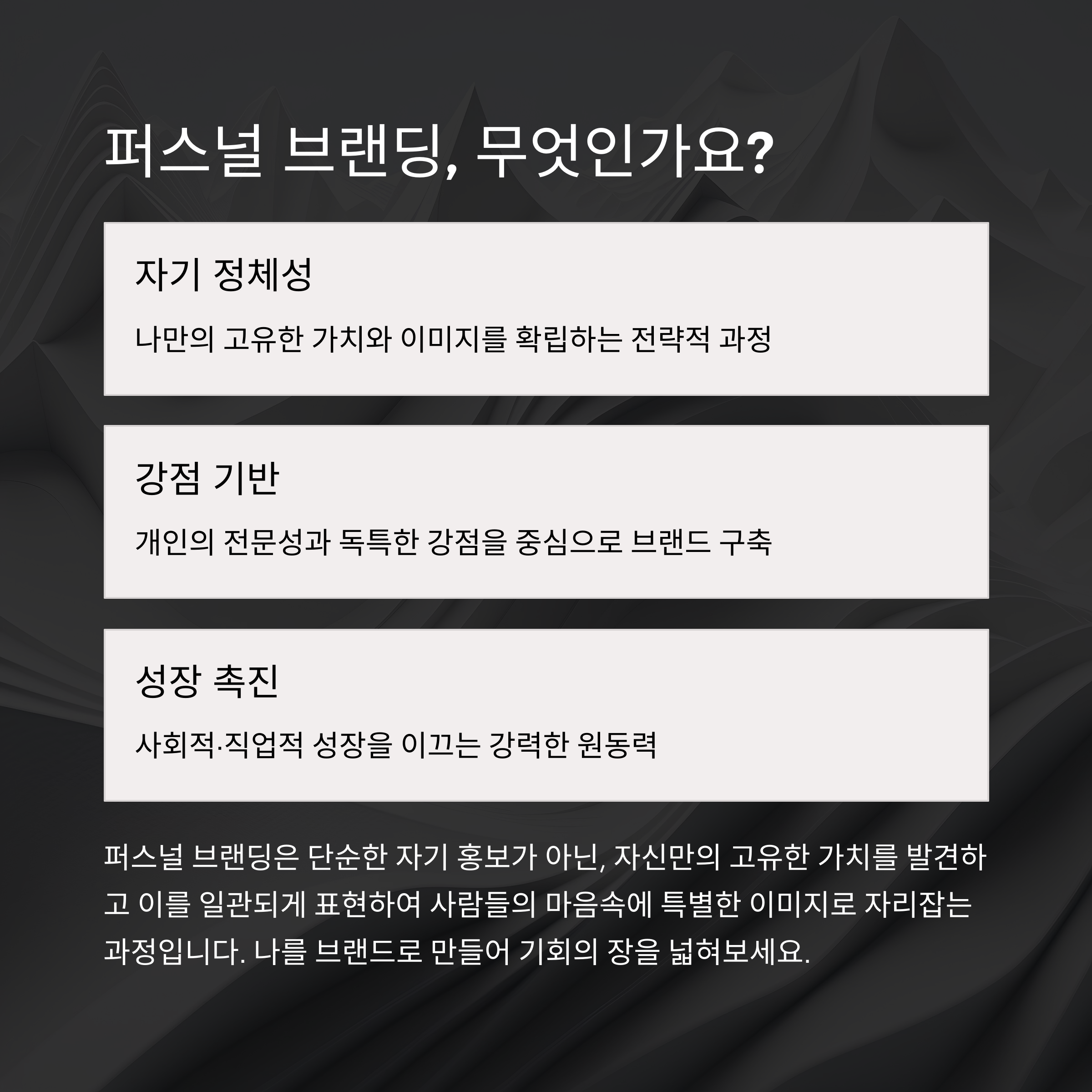 퍼스널 브랜딩은 자신만의 독특한 이미지를 만들고, 이를 통해 자신의 전문성을 강화하는 것입니다.