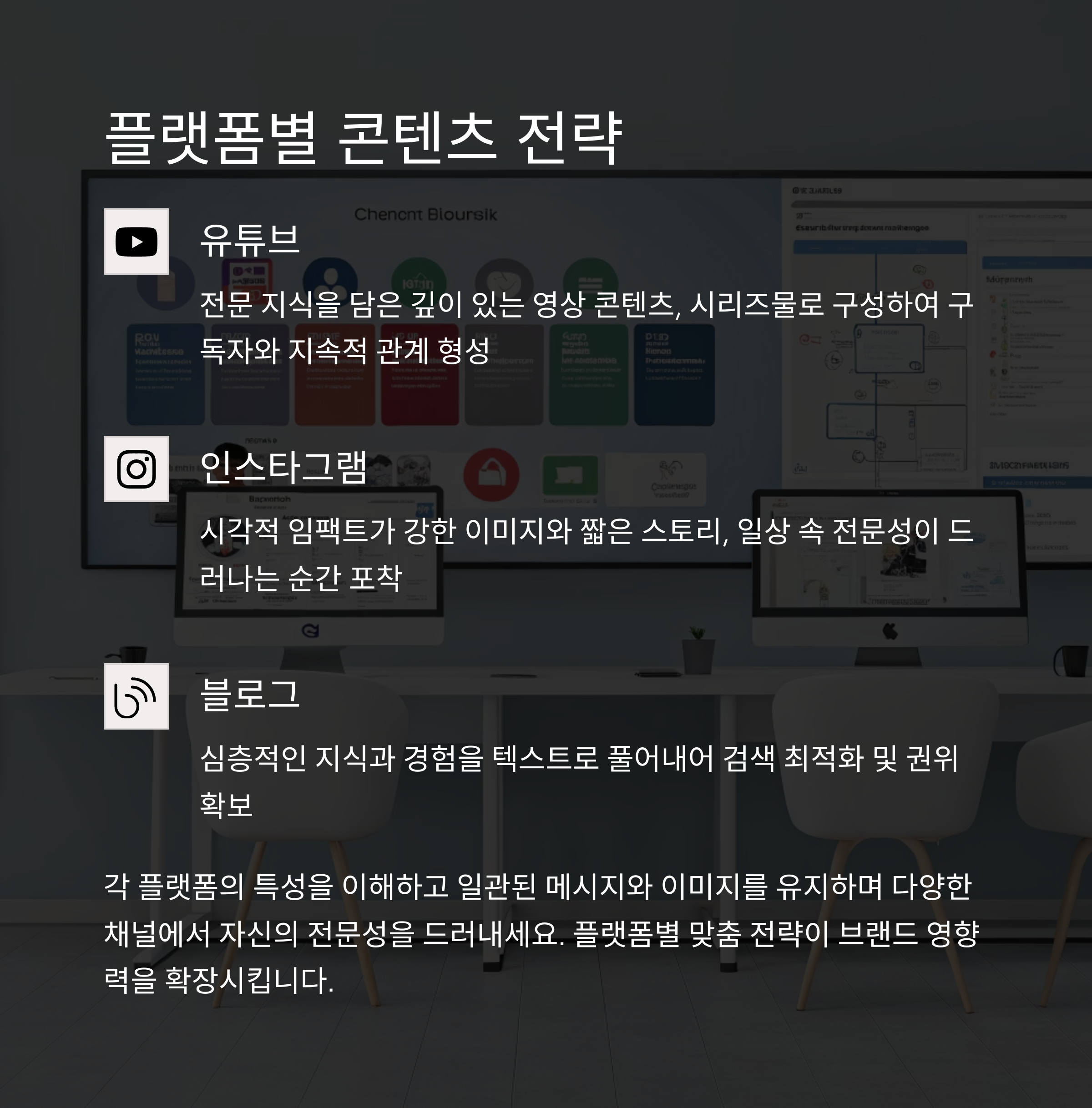 | 전문 콘텐츠 제작 | 일상 공유 및 소통 | 심도 있는 글 작성 | 전문 네트워크 구축 |