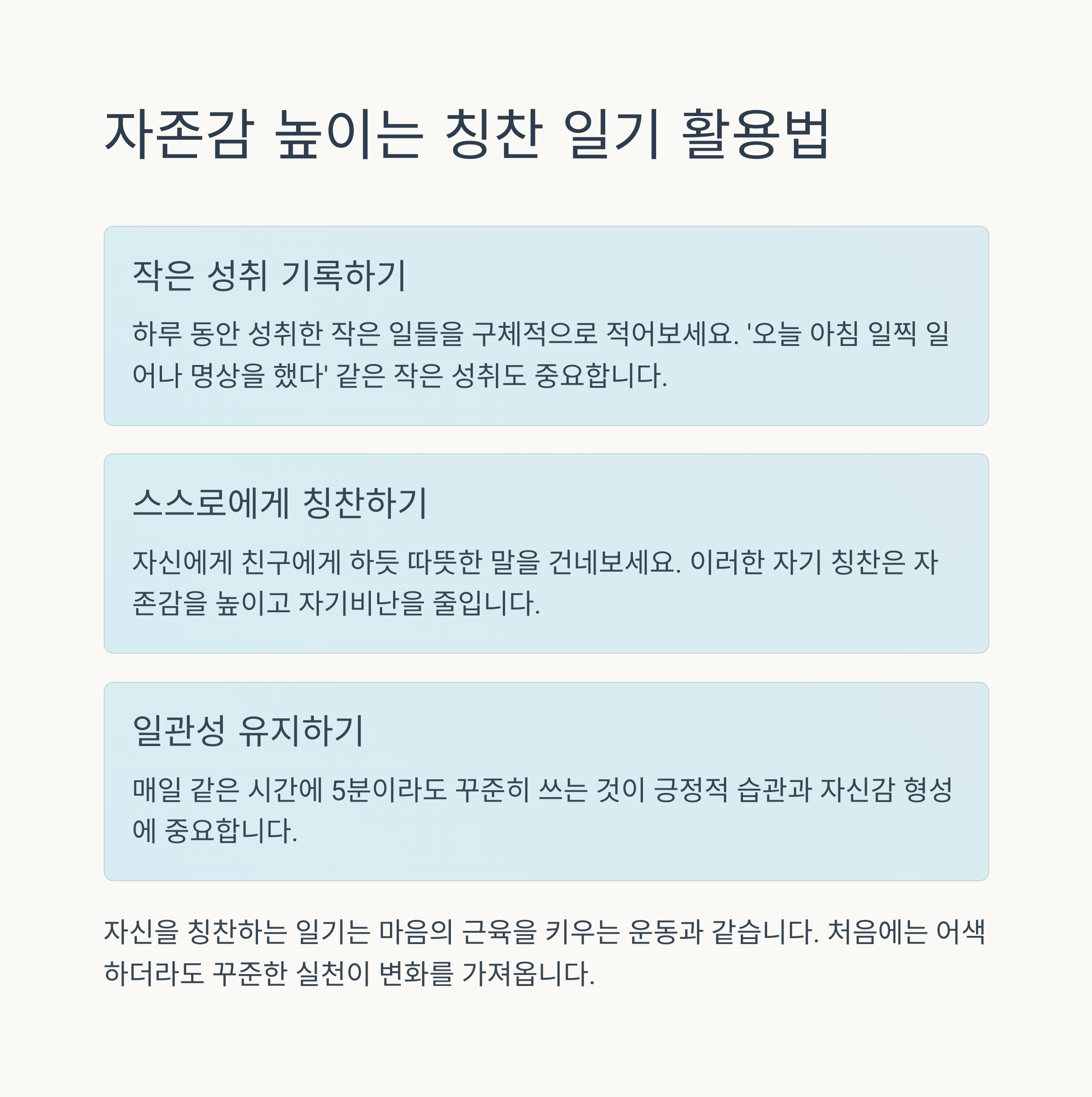 자신에게 편지를 쓰는 관행은 정신적 안정과 정서적 회복에 매우 유익합니다. 감사 편지 작성은 삶의 긍정적인 측면을 재발견하며, 행복감을 증가시키는 효과가 있습니다. 정서에 대한 솔직한 탐구는 개인의 성장을 촉진하고 자존감을 높여 줍니다. 지속적인 자기 표현의 실천은 앞으로의 삶에 긍정적인 영향을 미치고, 더 나은 나로 나아가는 데 기여합니다.