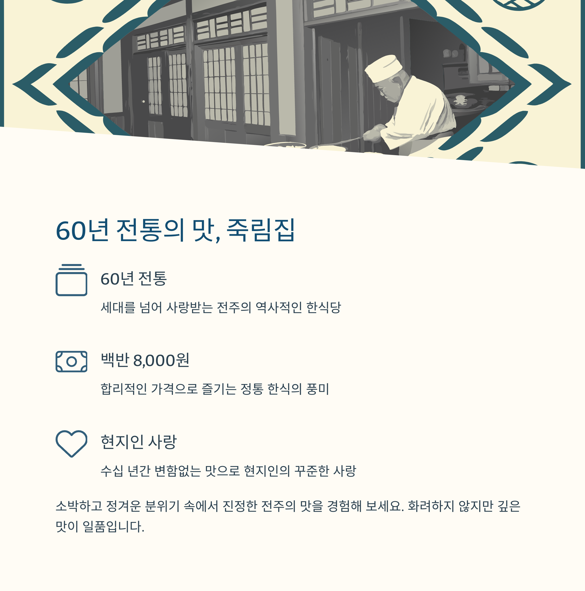 전주 한국식당과 죽림집은 모두가 추천할 만한 명소입니다.