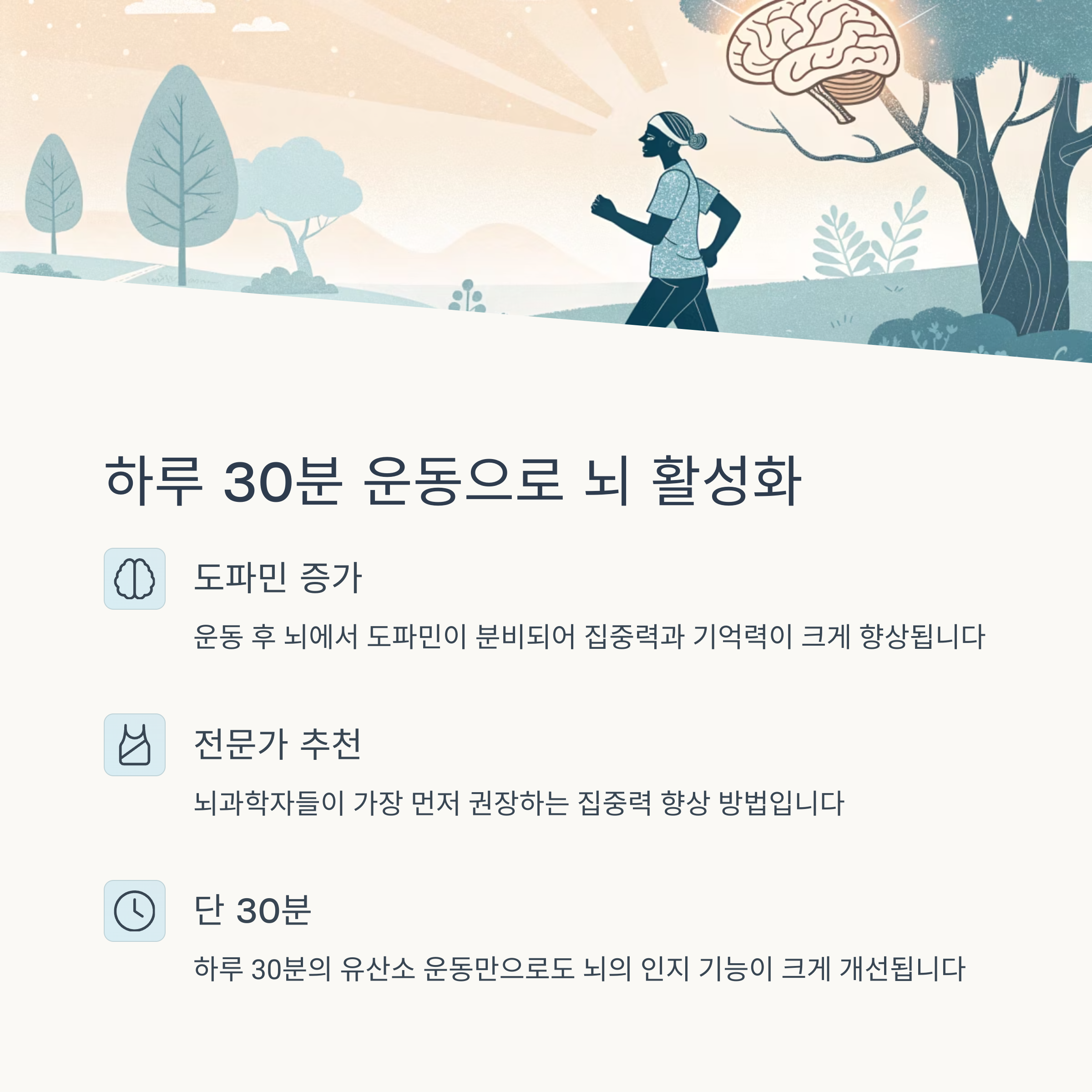 매일 30분의 규칙적인 운동은 뇌의 기민함과 집중력을 향상시키는데 긍정적인 영향을 미칩니다.
