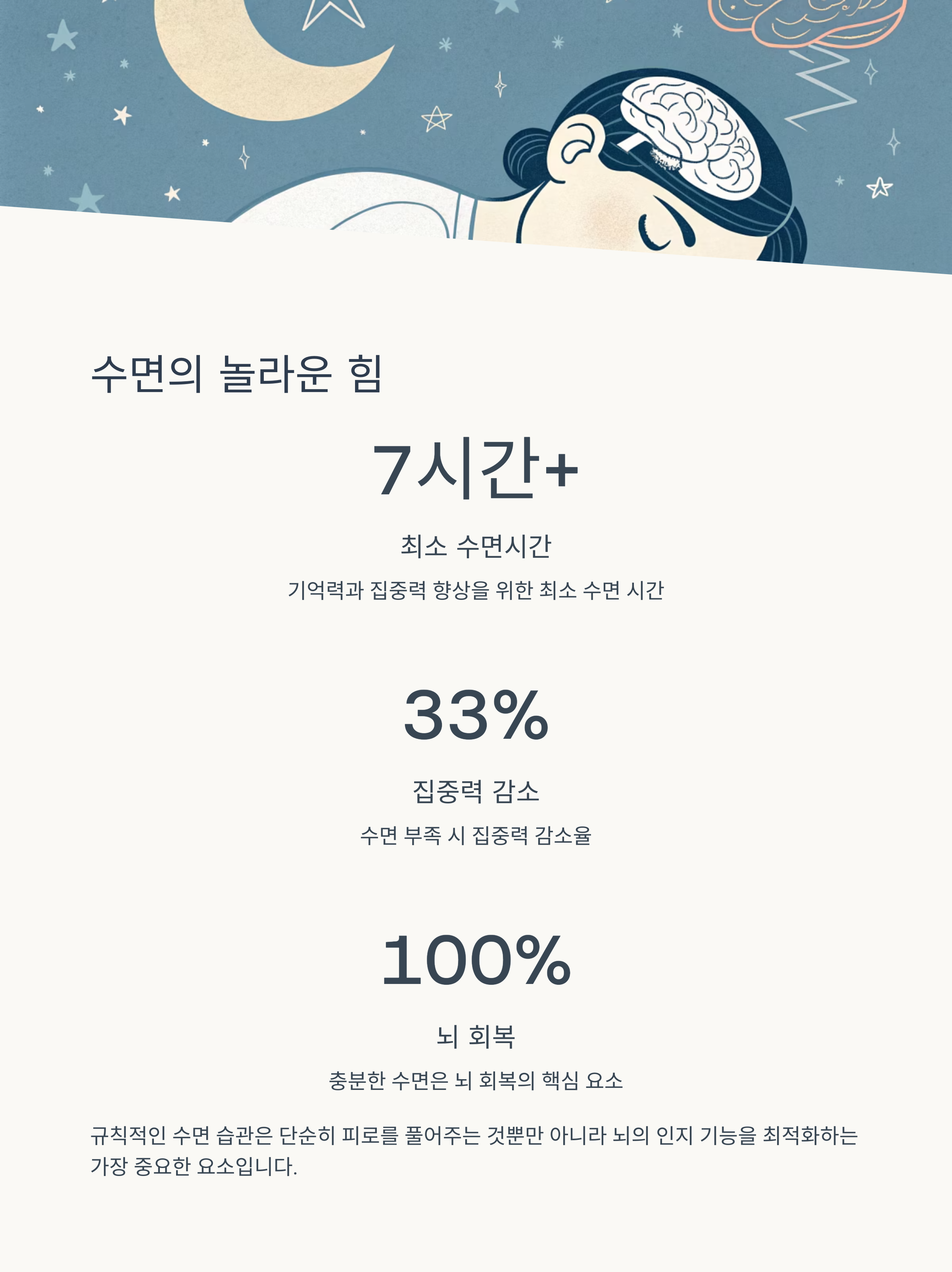 수면 부족은 집중력 저하의 주요 원인으로, 최소 7시간의 수면은 필수적입니다.
