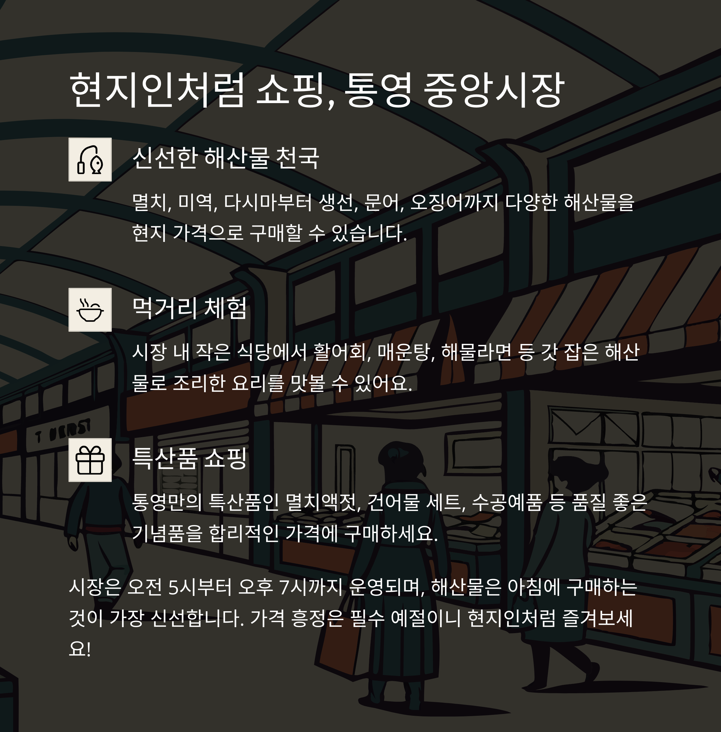 통영 중앙시장은 현지인들과 관광객들이 함께 즐기는 장터입니다.