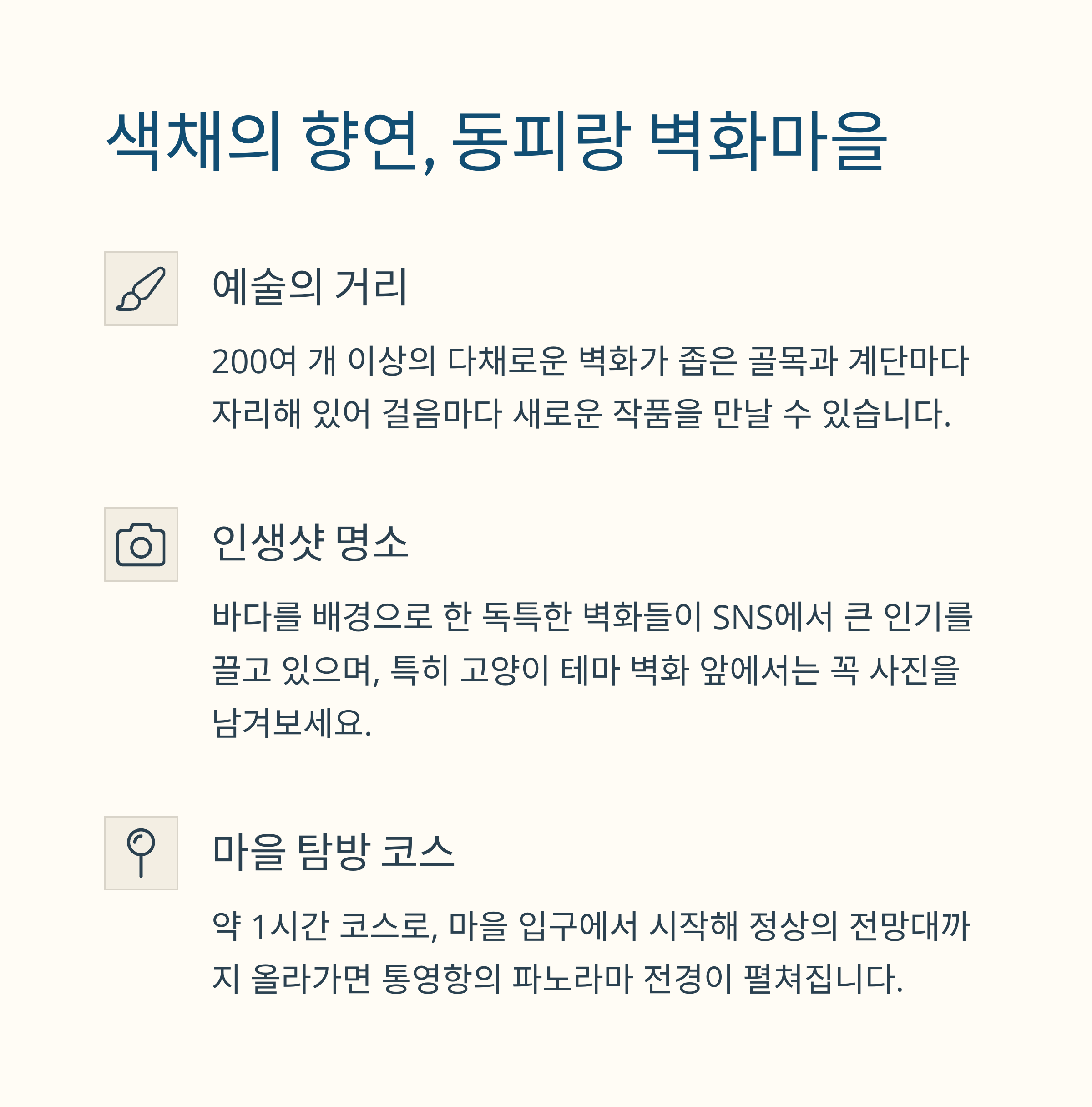 통영의 주요 명소인 동피랑 벽화마을을 시작으로 멋진 여행을 시작해 보세요.