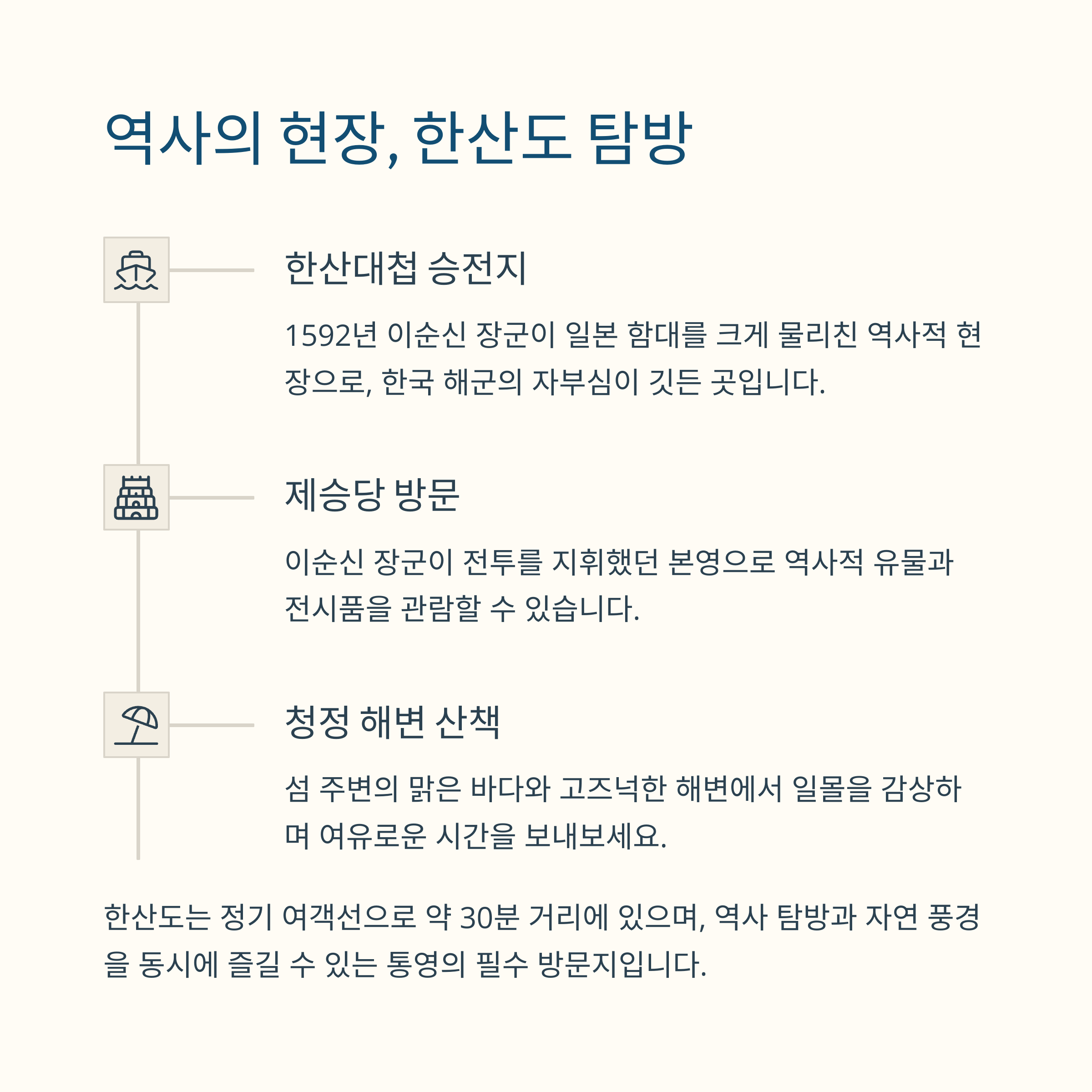 오후에는 한산도를 방문하여 역사적인 풍경과 함께 여유로운 시간을 보낼 수 있습니다.