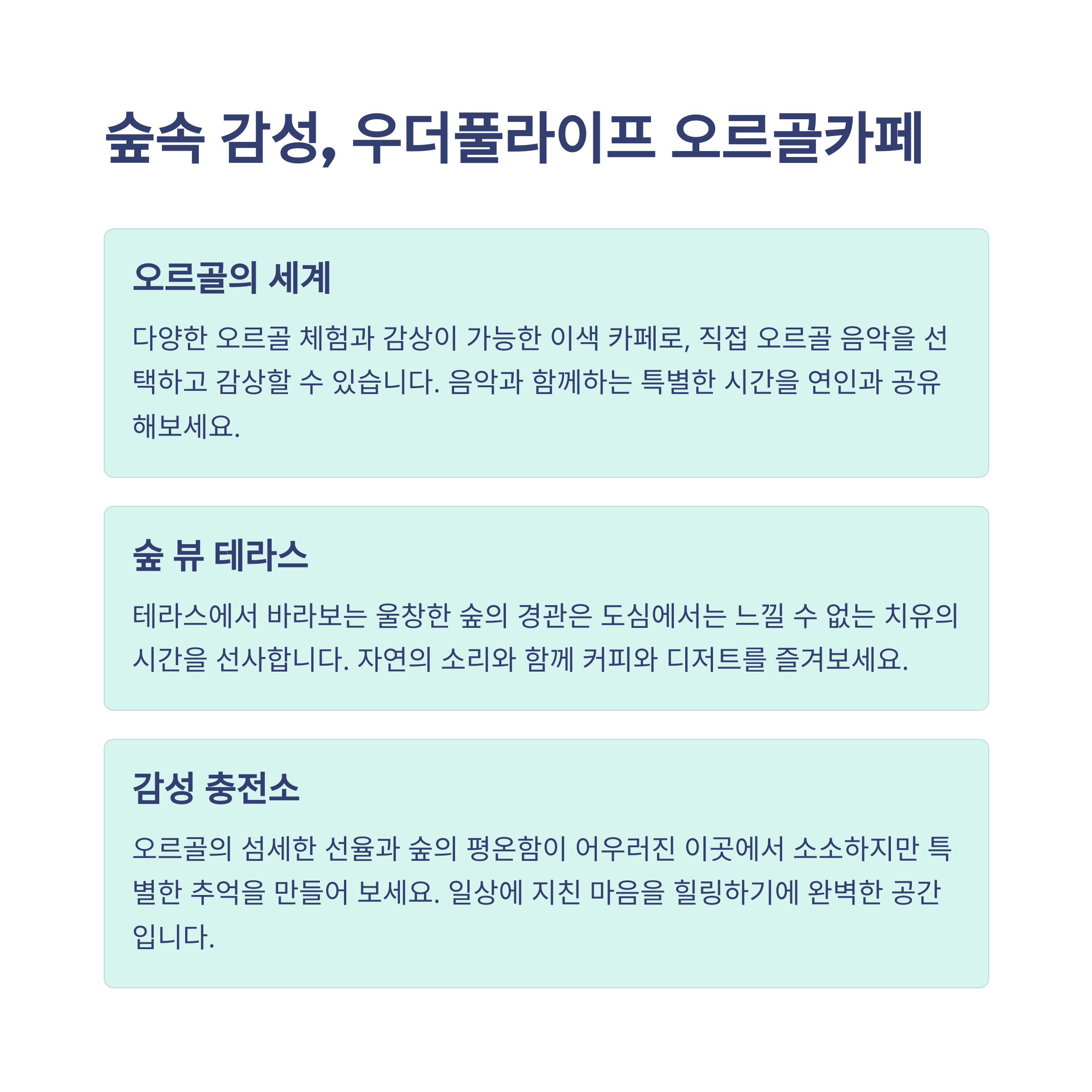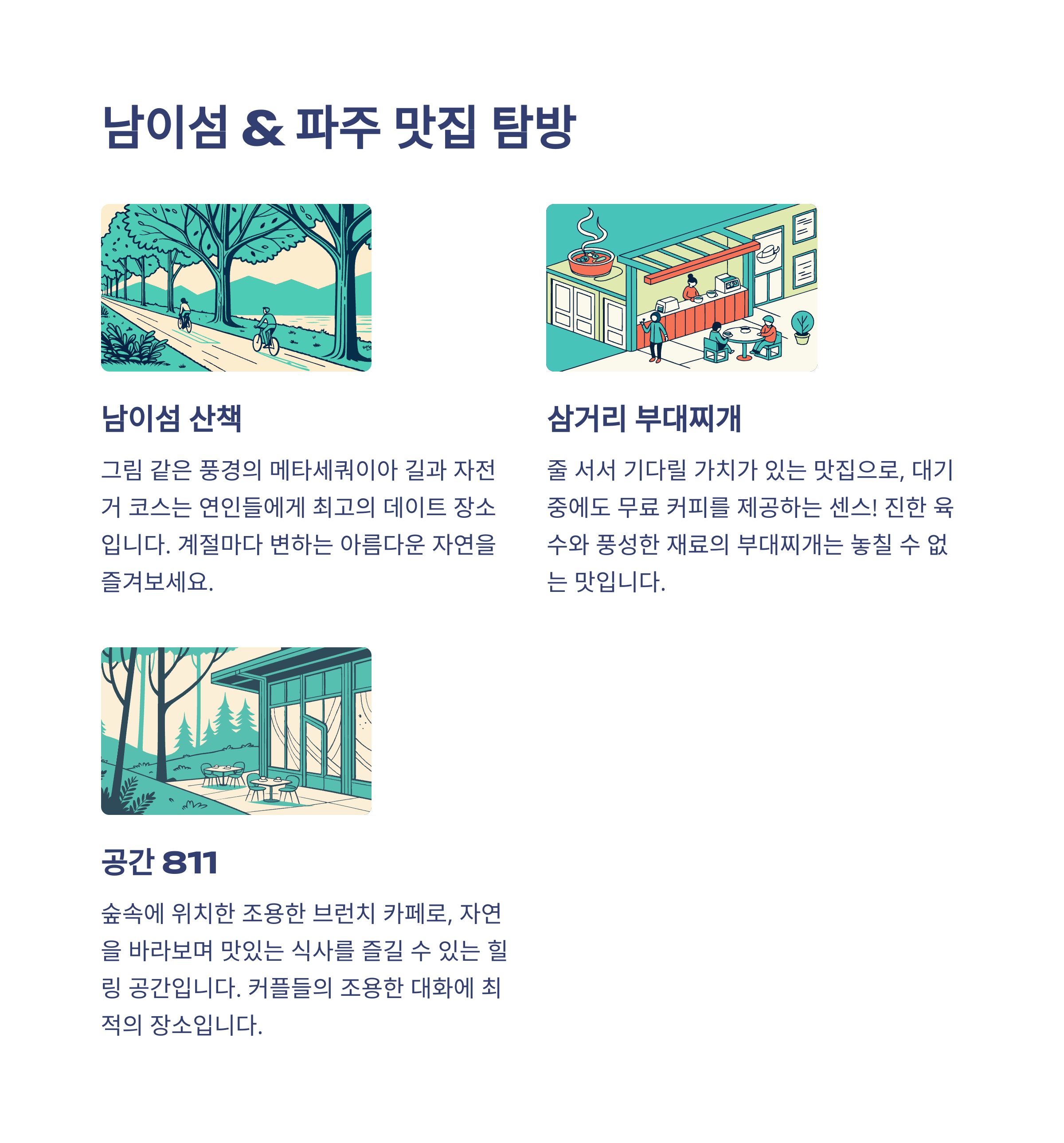 | 가장 추천하는 명소 | 힐링과 감성의 공간 |