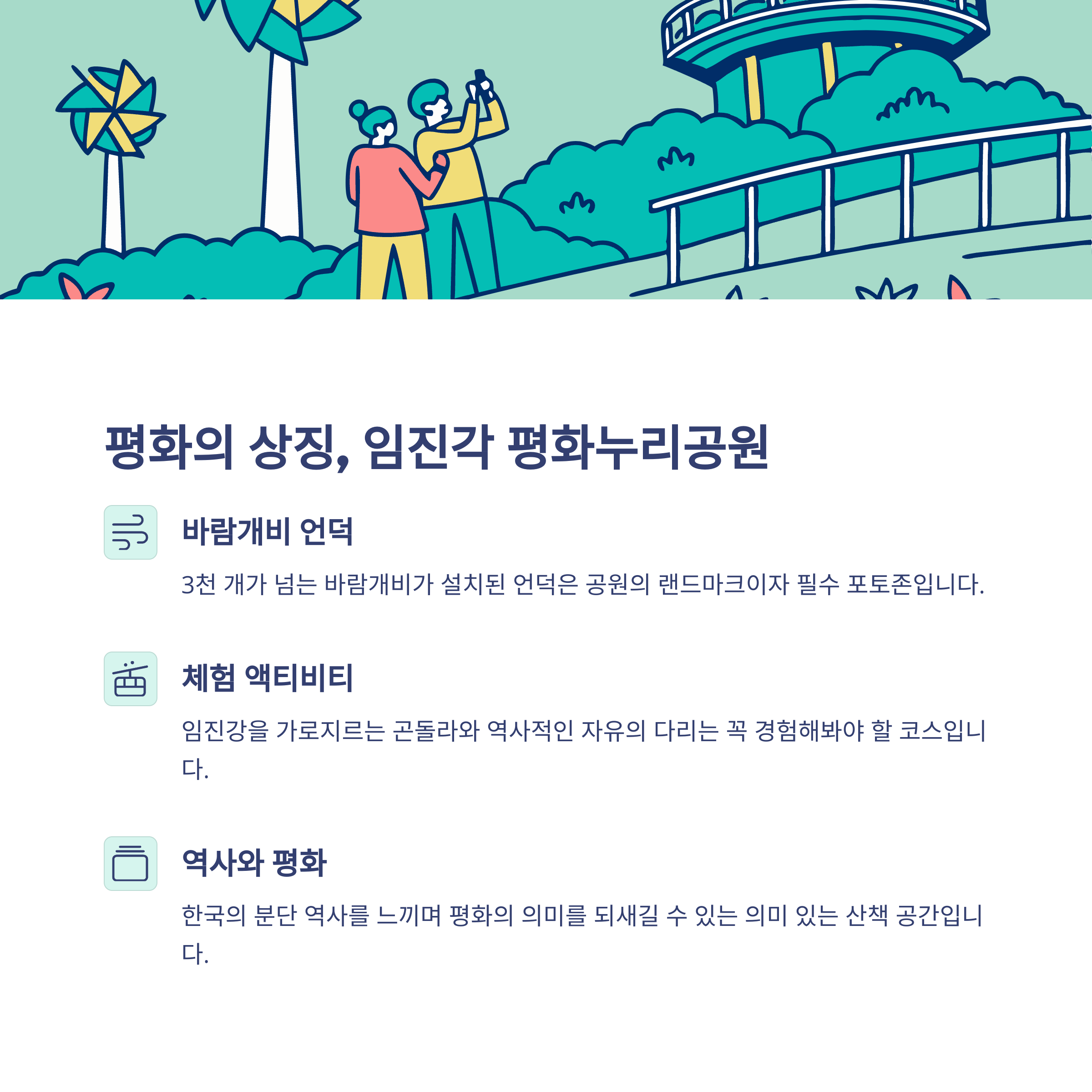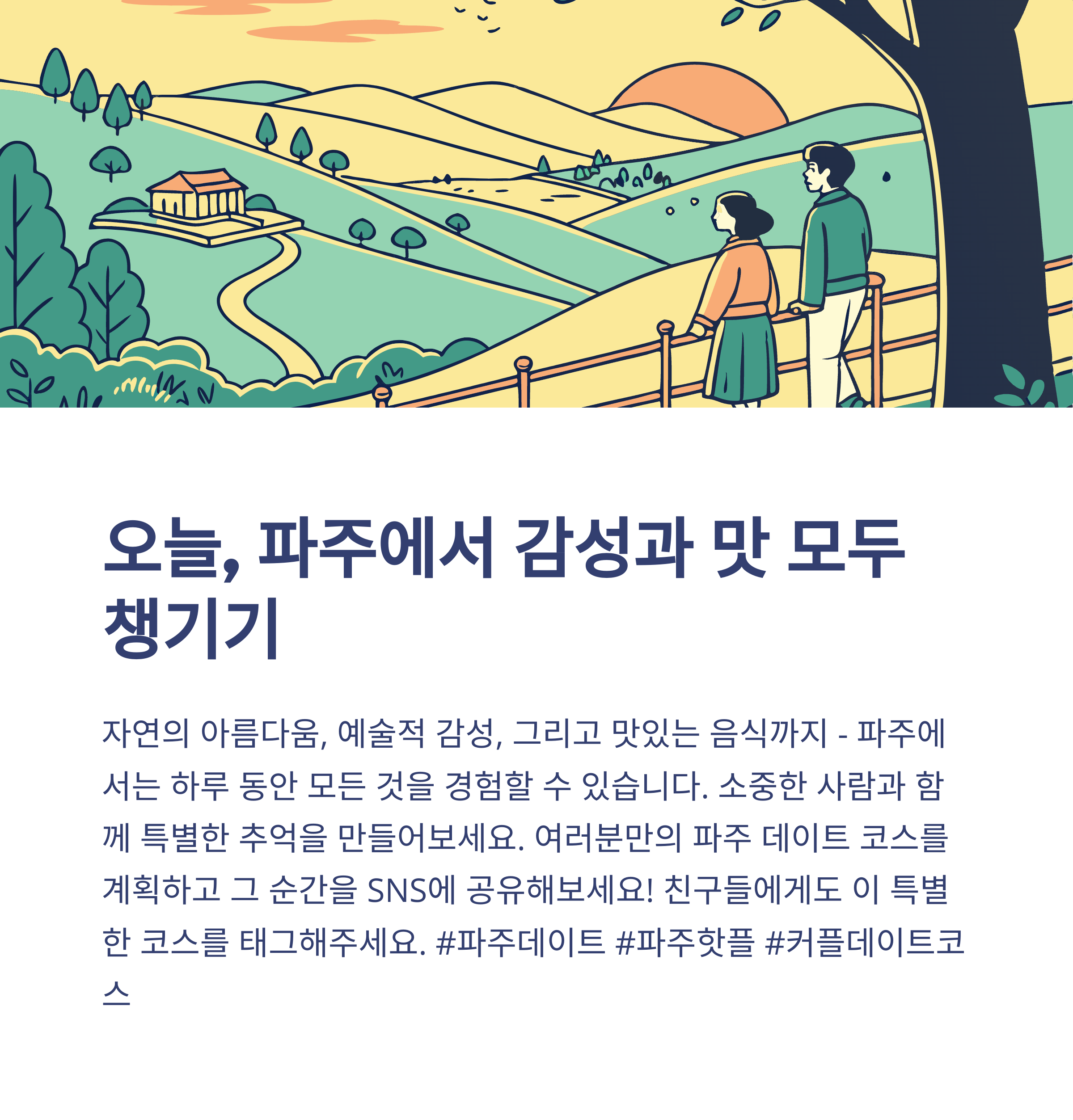 파주에는 다양한 데이트 장소가 있습니다. 벽초지문화수목원에서는 사계절의 아름다운 꽃들을 경험할 수 있습니다. 헤이리 예술마을에서는 문화예술 활동을 즐길 수 있습니다. 퍼스트가든은 쾌적한 드라이브 후의 힐링 공간입니다. 임진각 평화누리공원에서 역사를 느끼며 산책할 수 있습니다. |