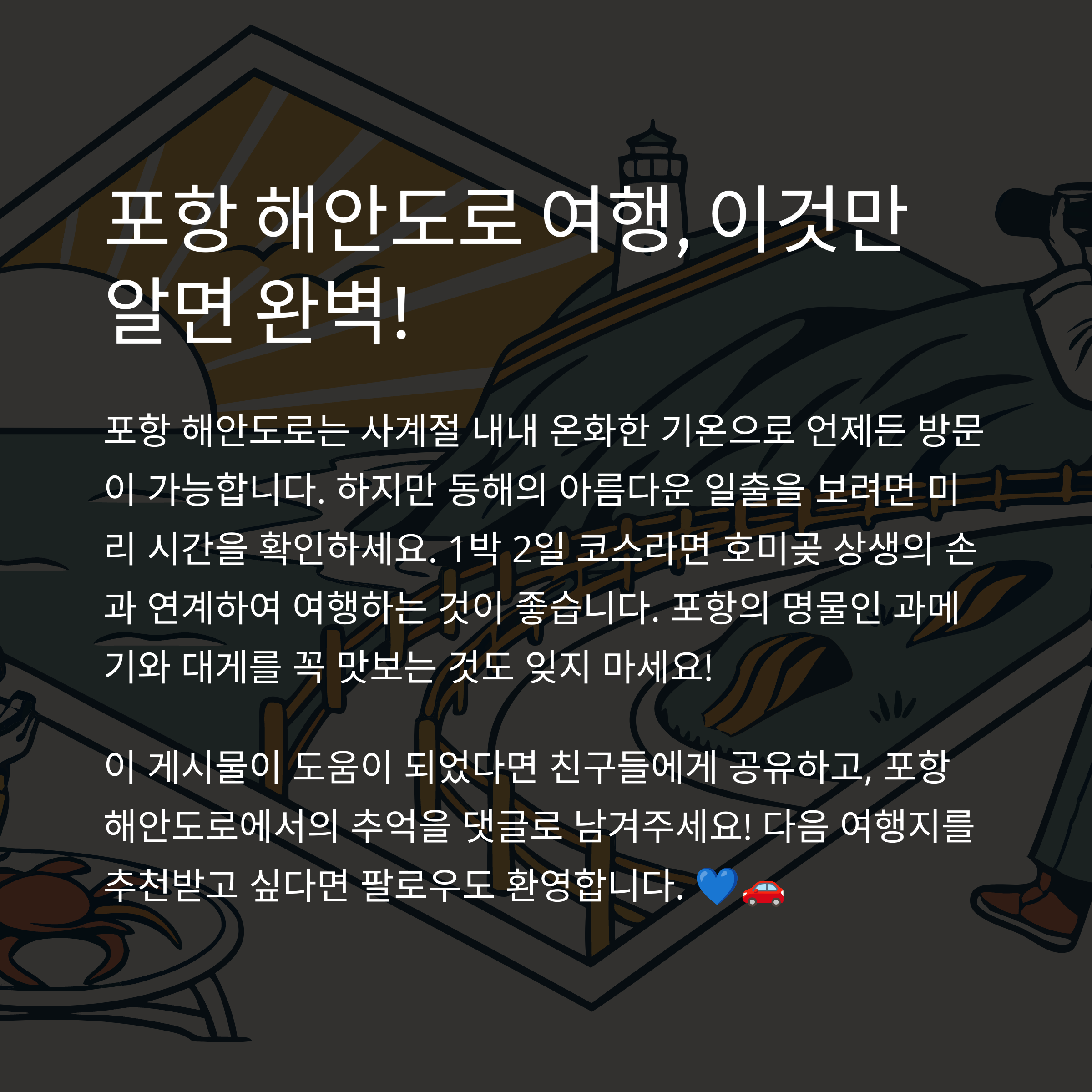 포항 해안도로는 가족, 친구들과 함께 다시 찾고 싶은 장소로 자리 잡을 것입니다.