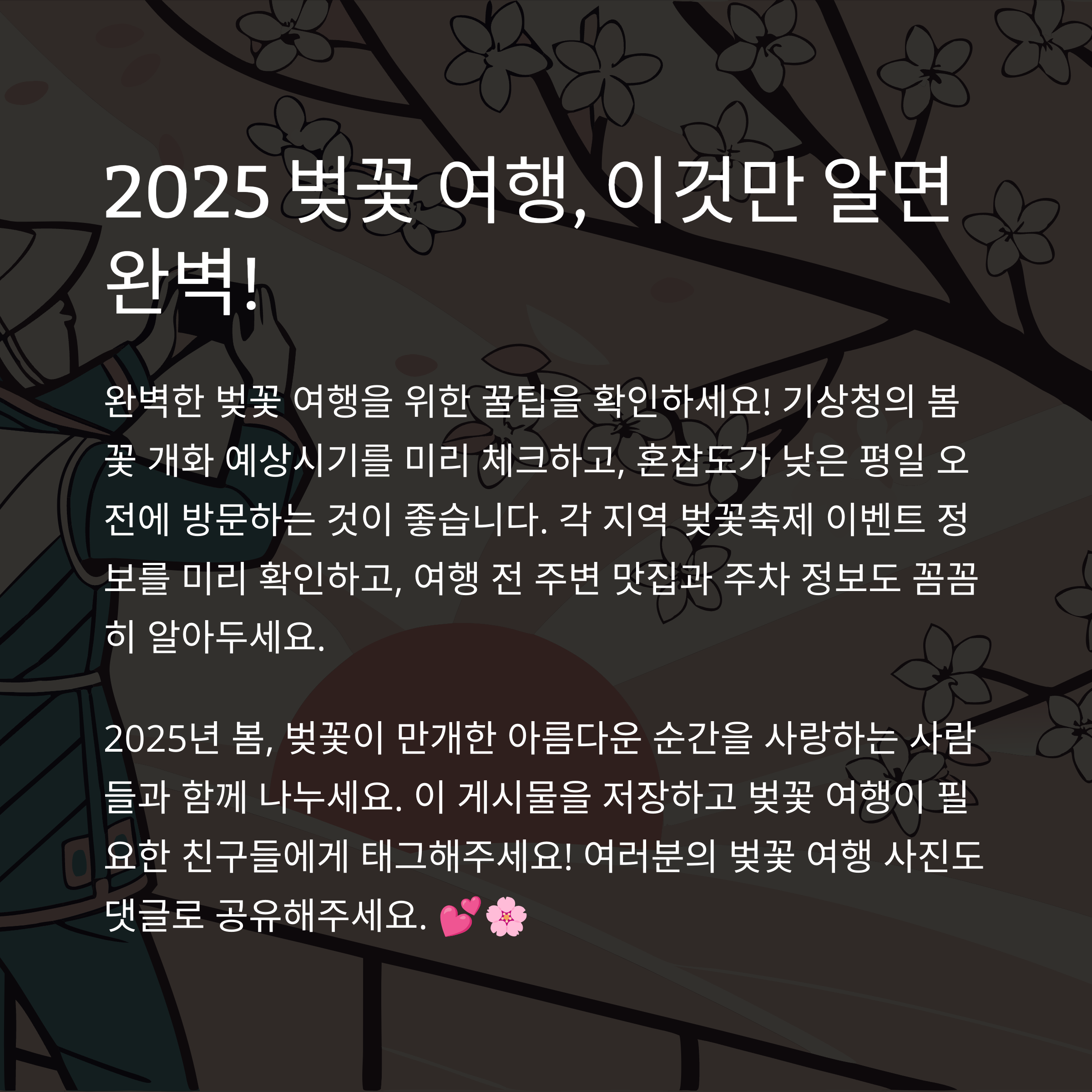미리 계획하여 완벽한 벚꽃 여행을 즐기시길 바랍니다.