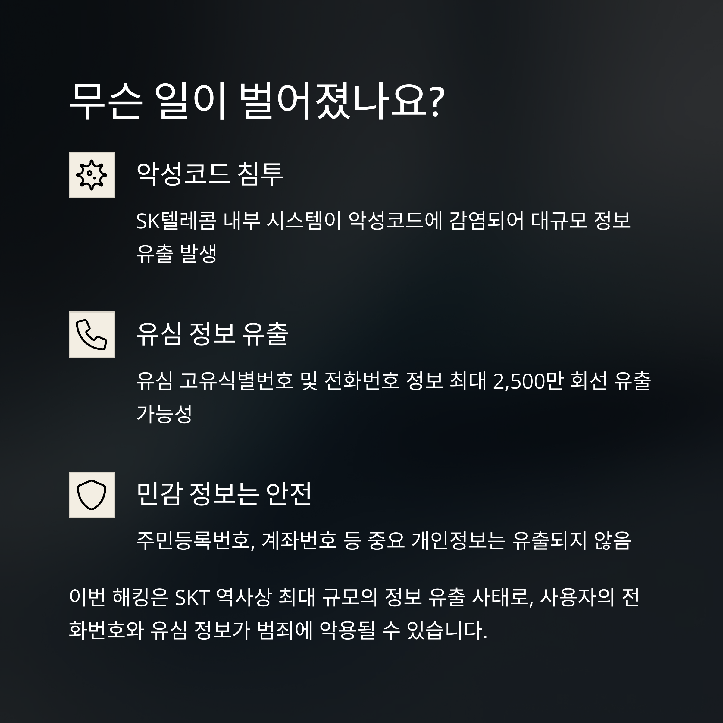 최근 SK텔레콤의 유심 해킹 사건으로 인해 많은 고객이 피해를 입고 있습니다.