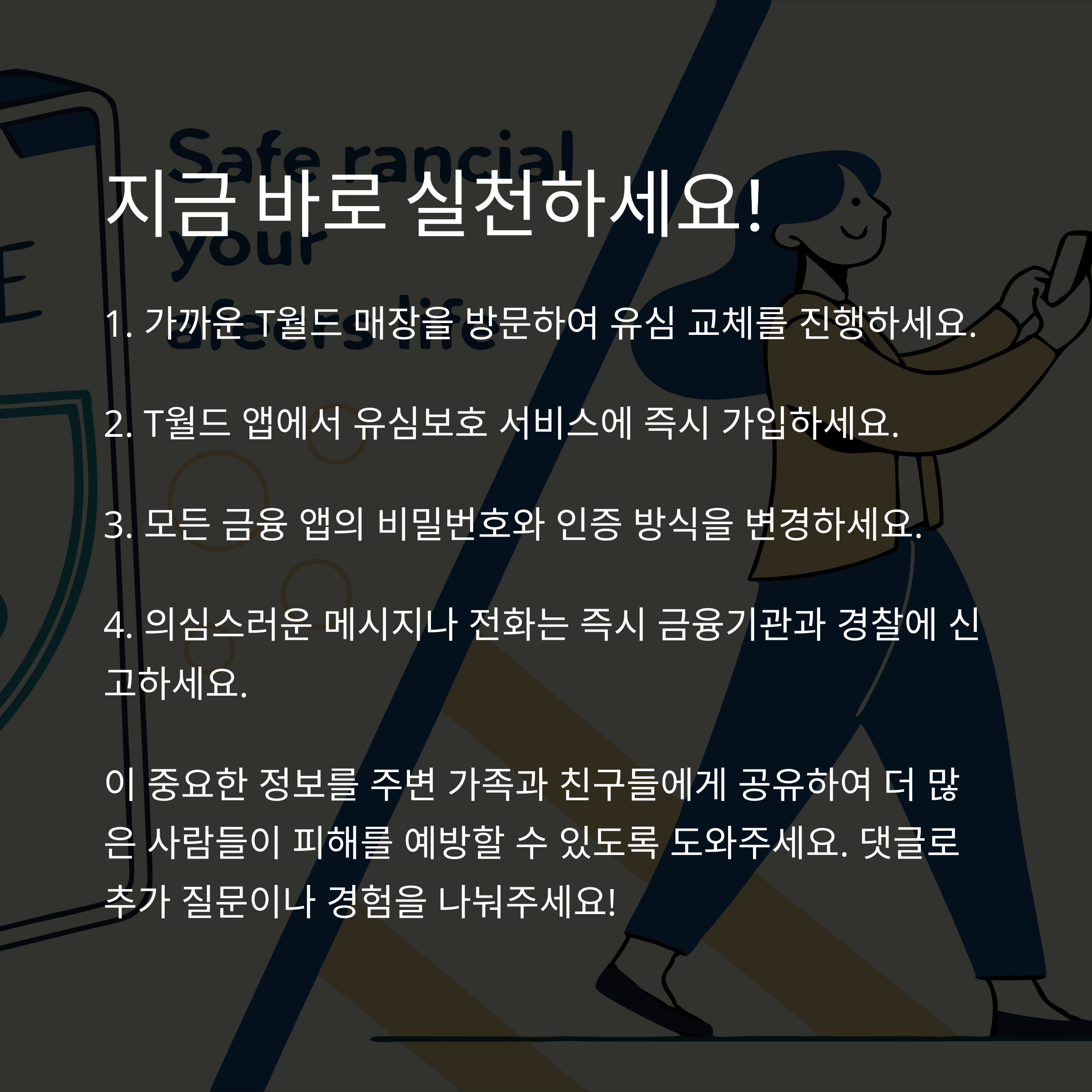 | 고객들은 유심 교체와 보호 서비스 가입이 필요합니다. 유심 해킹으로부터 보호받기 위해 유심복제 방지 서비스를 이용해야 합니다. 금융 사기 예방을 위해서는 금융기관과 협력하여 보안 절차를 강화해야 합니다. 정기적인 확인을 통해 본인의 금융계좌 및 정보에 이상이 없는지 점검해야 합니다. 의심 사항 발생 시 즉시 신고하여 추가 피해를 방지해야 합니다. |